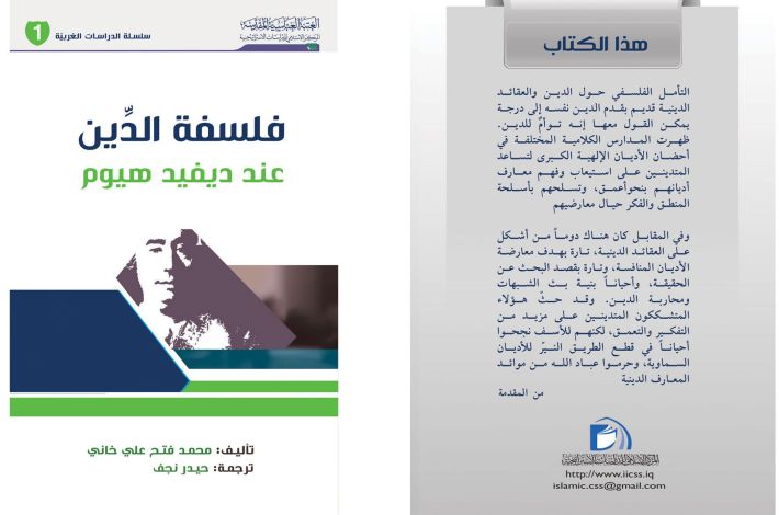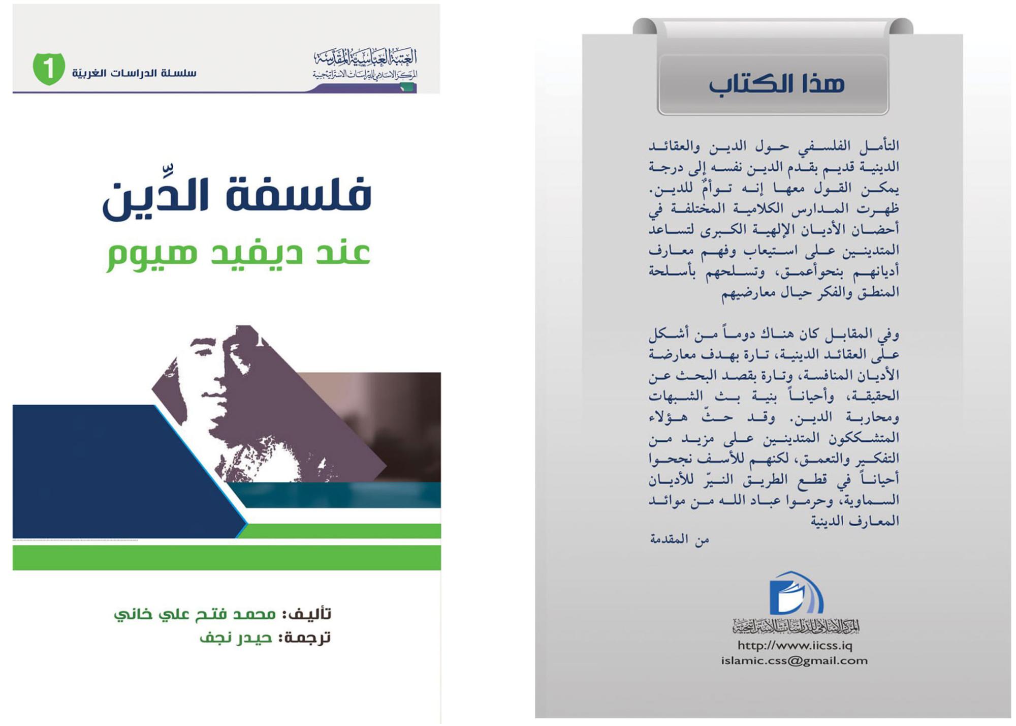 روضہ مبارک حضرت عباس(ع) کے شعبہ برائے فکری وثقافتی امور کے ذیلی ادارے اسلامک سنٹر فار سٹریٹیجک سٹڈیز نے (فلسفة الدين عند ديفيد هيوم) کے نام سے نئی کتاب شائع کی ہے۔