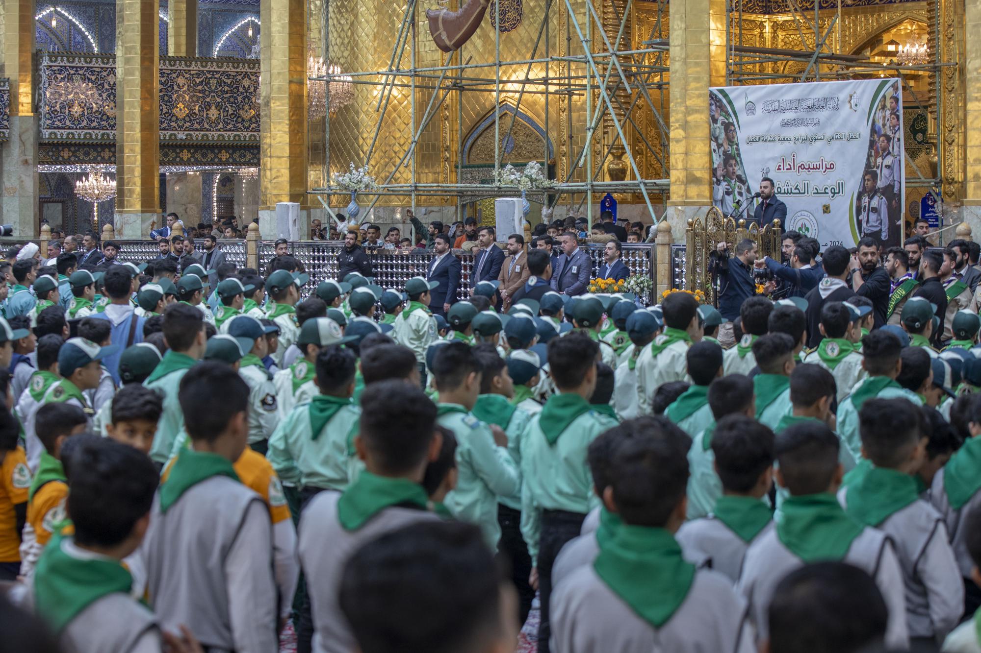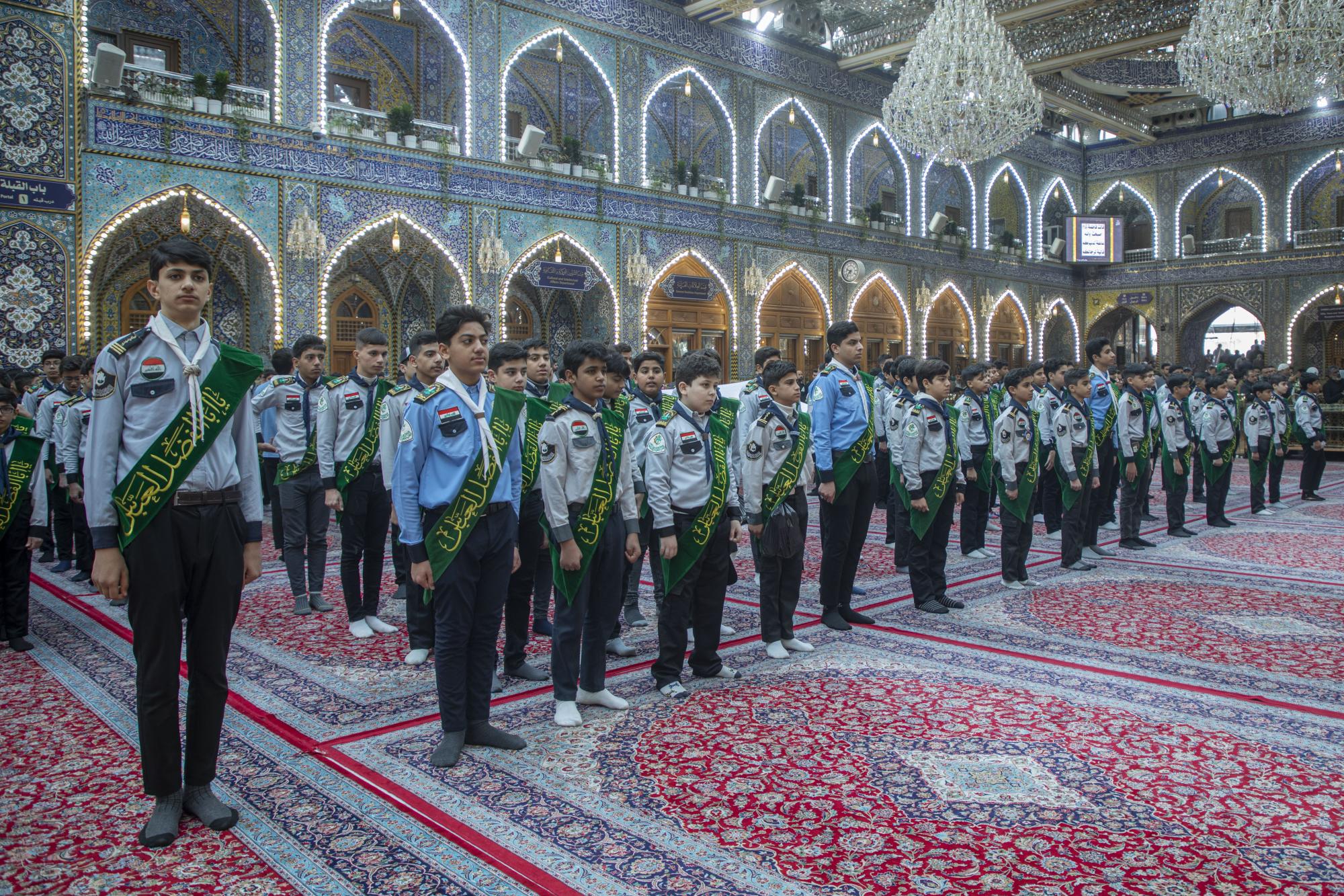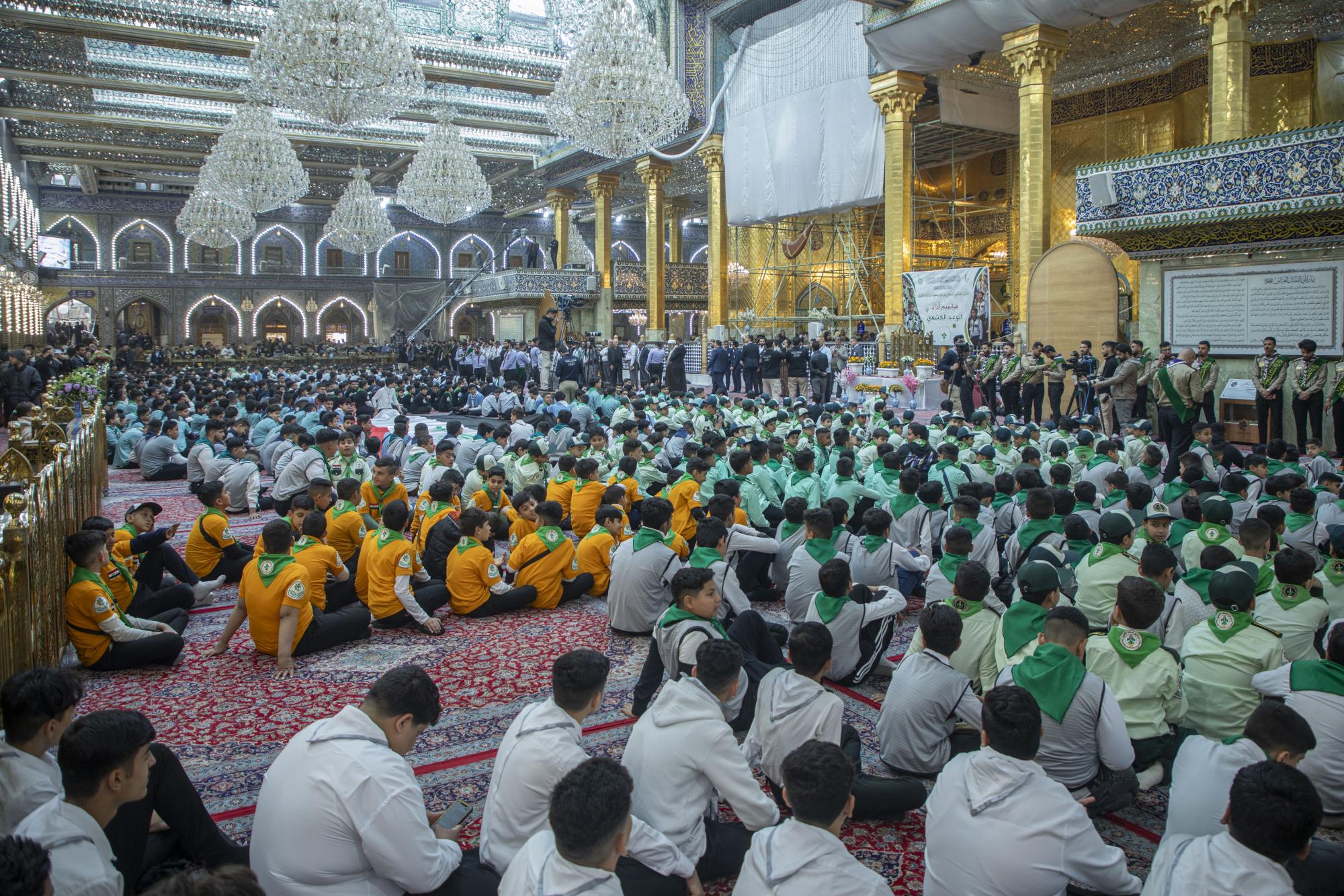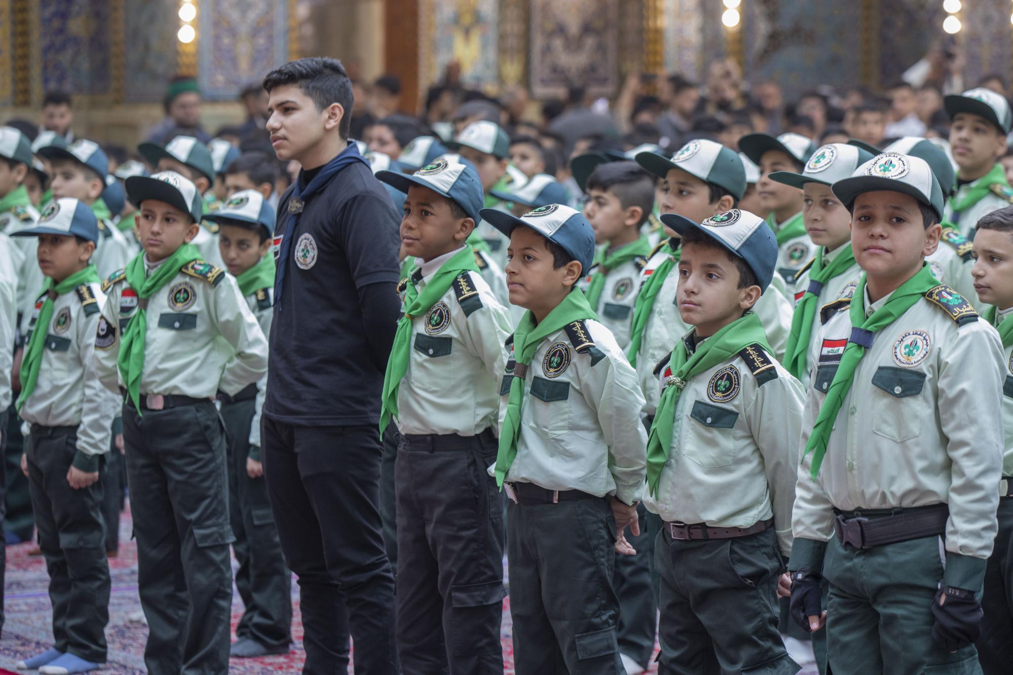 Plus de 1000 scouts ont participé à la cérémonie, arrivant au sanctuaire sacré d'al-Abbas (p) par les portes de l'Imam Ali et de l'Imam Al Hussein (que la paix soit sur eux), pour se rassembler dans les sous-sols de l'Imam Ali et de l'Imam Al Hassan (que la paix soit sur eux) en préparation de l'entrée dans la cour d'Aba al-Fadl al-Abbas (que la paix soit sur lui) et de l'accomplissement du serment de scout dans sa cour sacrée.