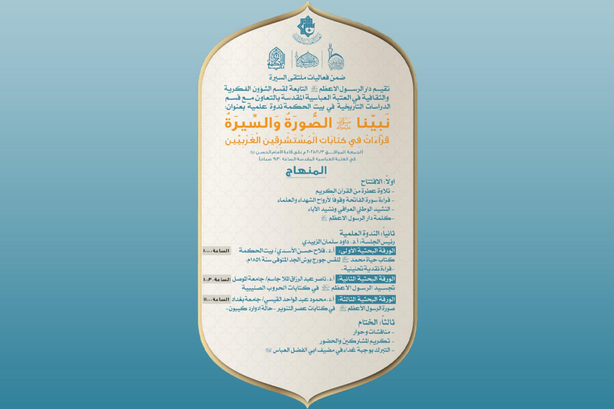 این نشست تحت عنوان: (نبينا "صلى الله عليه وآله" الصورة والسيرة: قراءات في كتابات المستشرقين الغربيّين: پیامبر ما "صلی الله علیه وآله" صورت و سیرت: خوانشهايی در نوشته های شرق شناسان غربی) برگزار میشود.