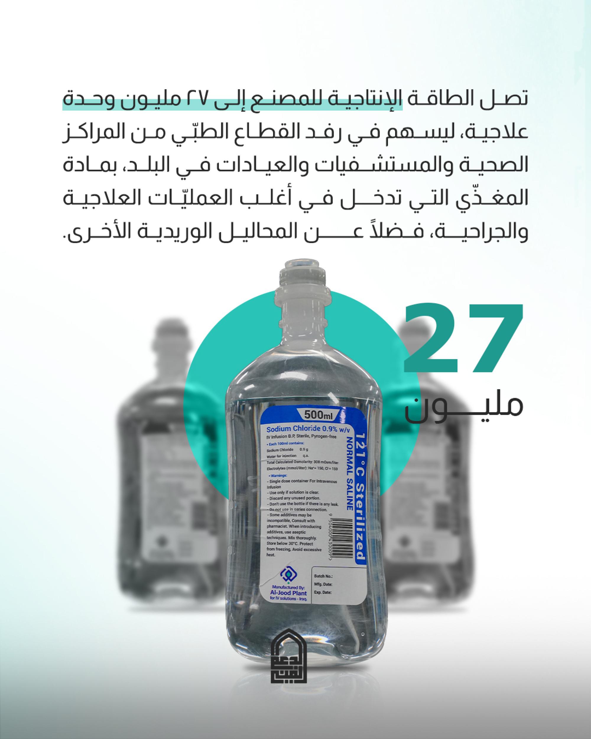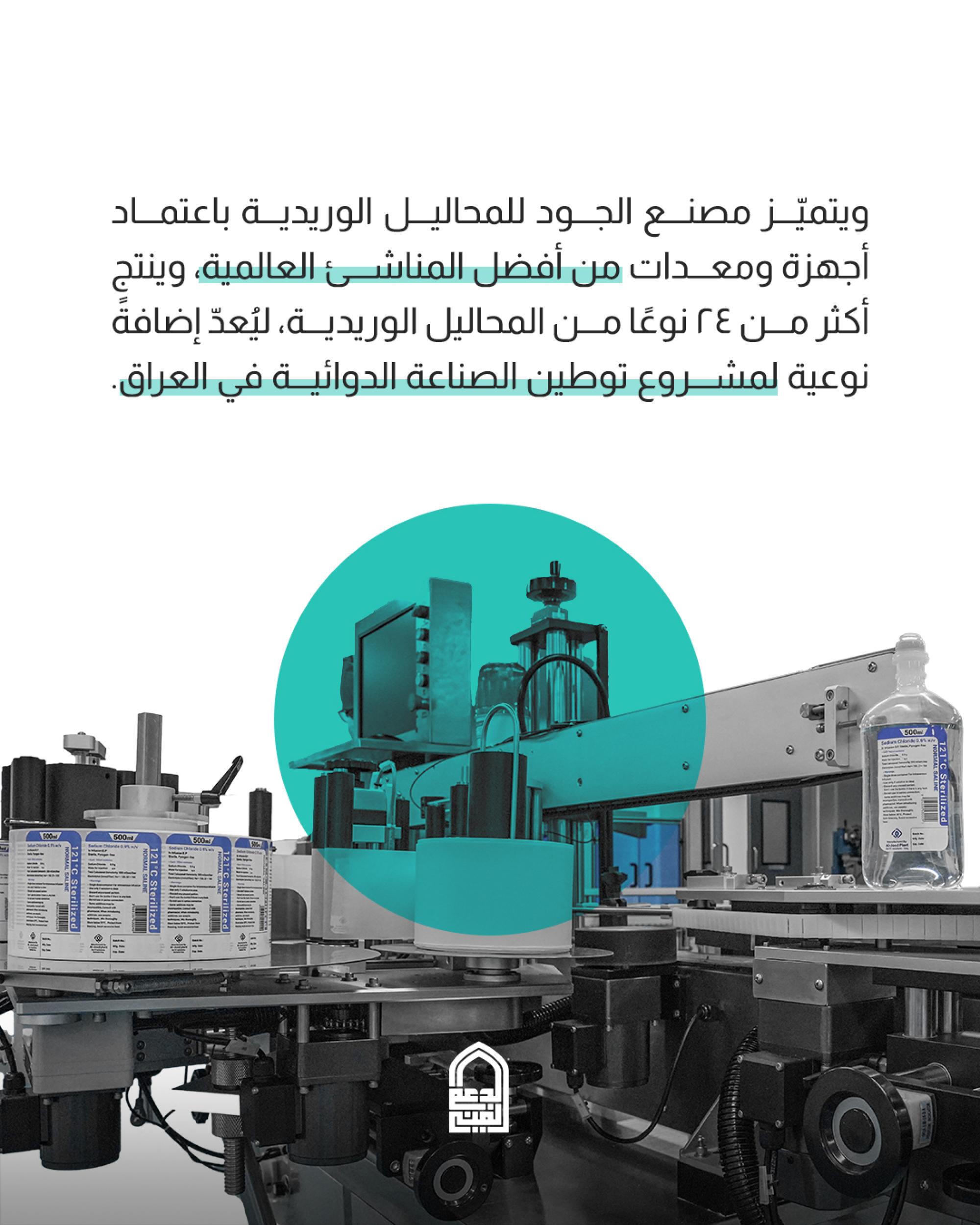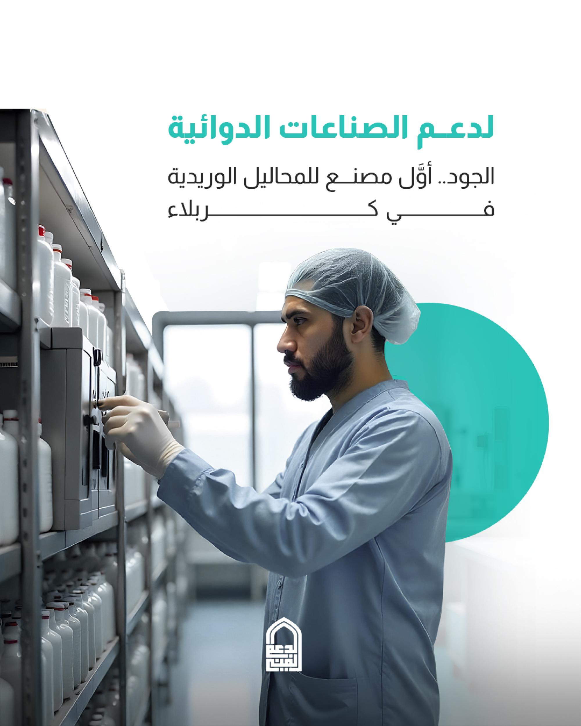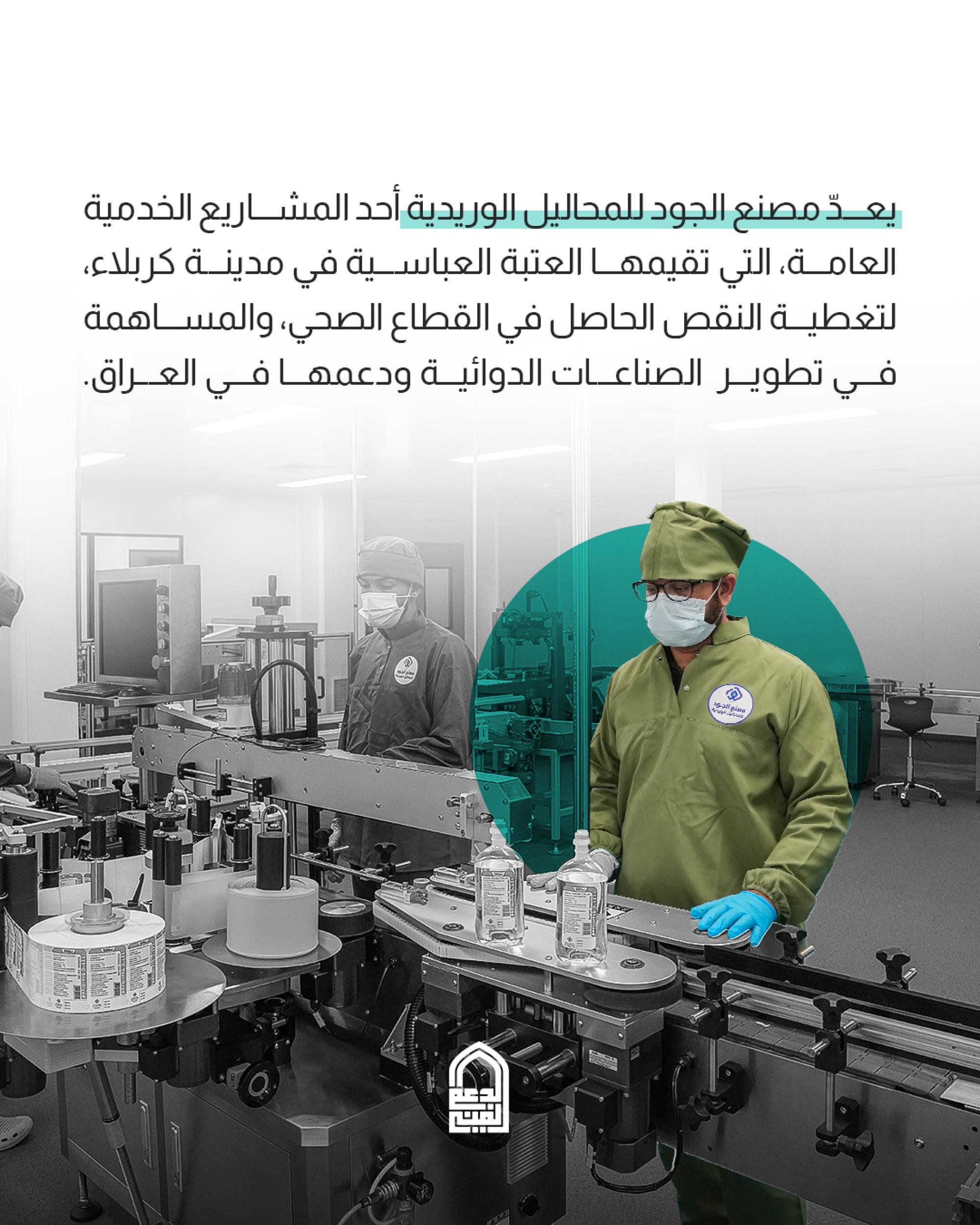 روضہ مبارک حضرت عباس(ع) کی طرف سے کربلا میں لگائے گئے "محلولِ وریدی" (Intravenous solution) کے پہلے کارخانے "مصنع الجود للمحاليل الوريدية" کے بارے میں