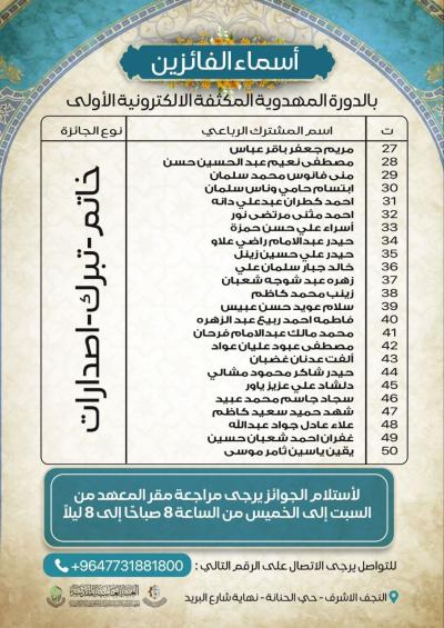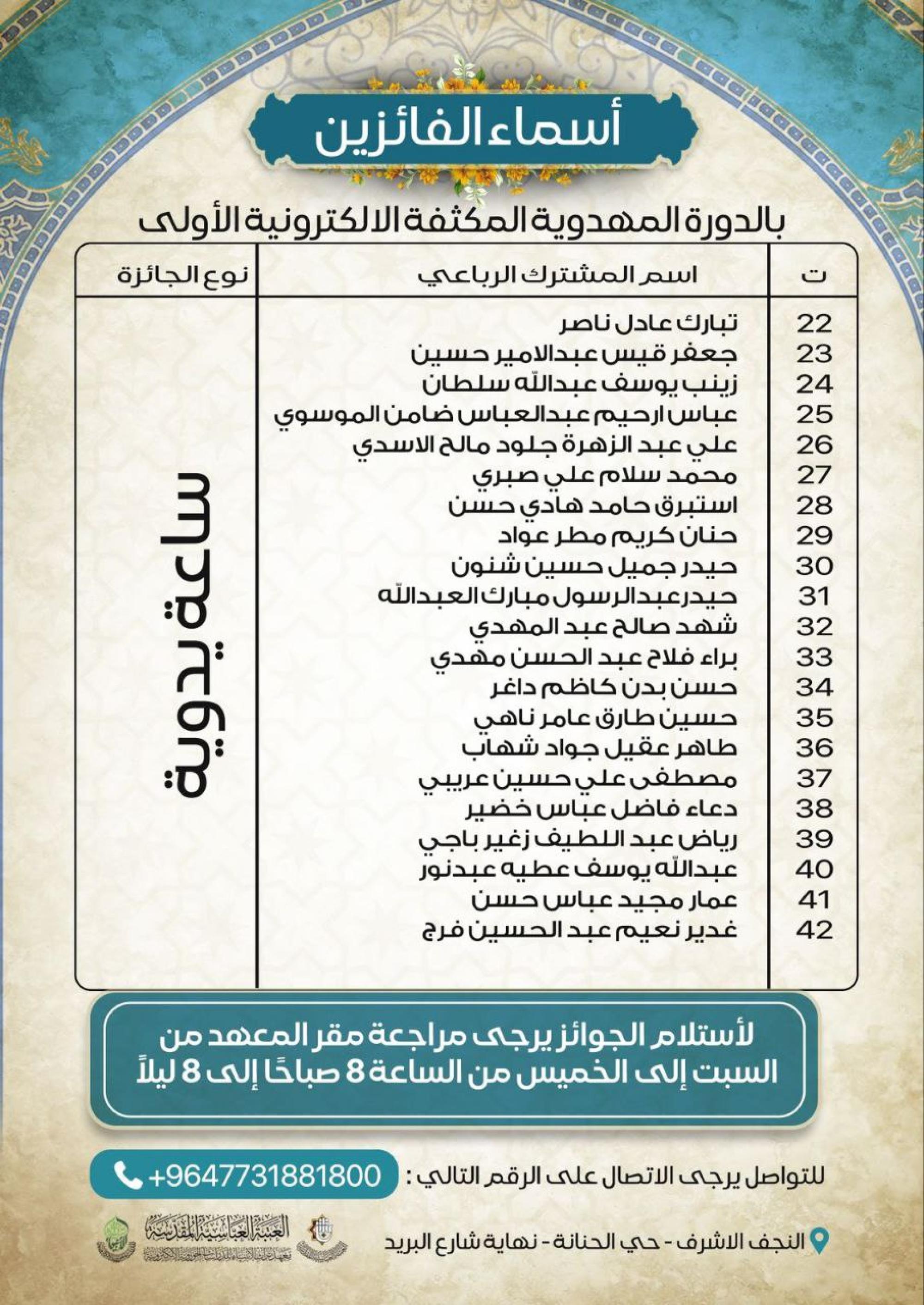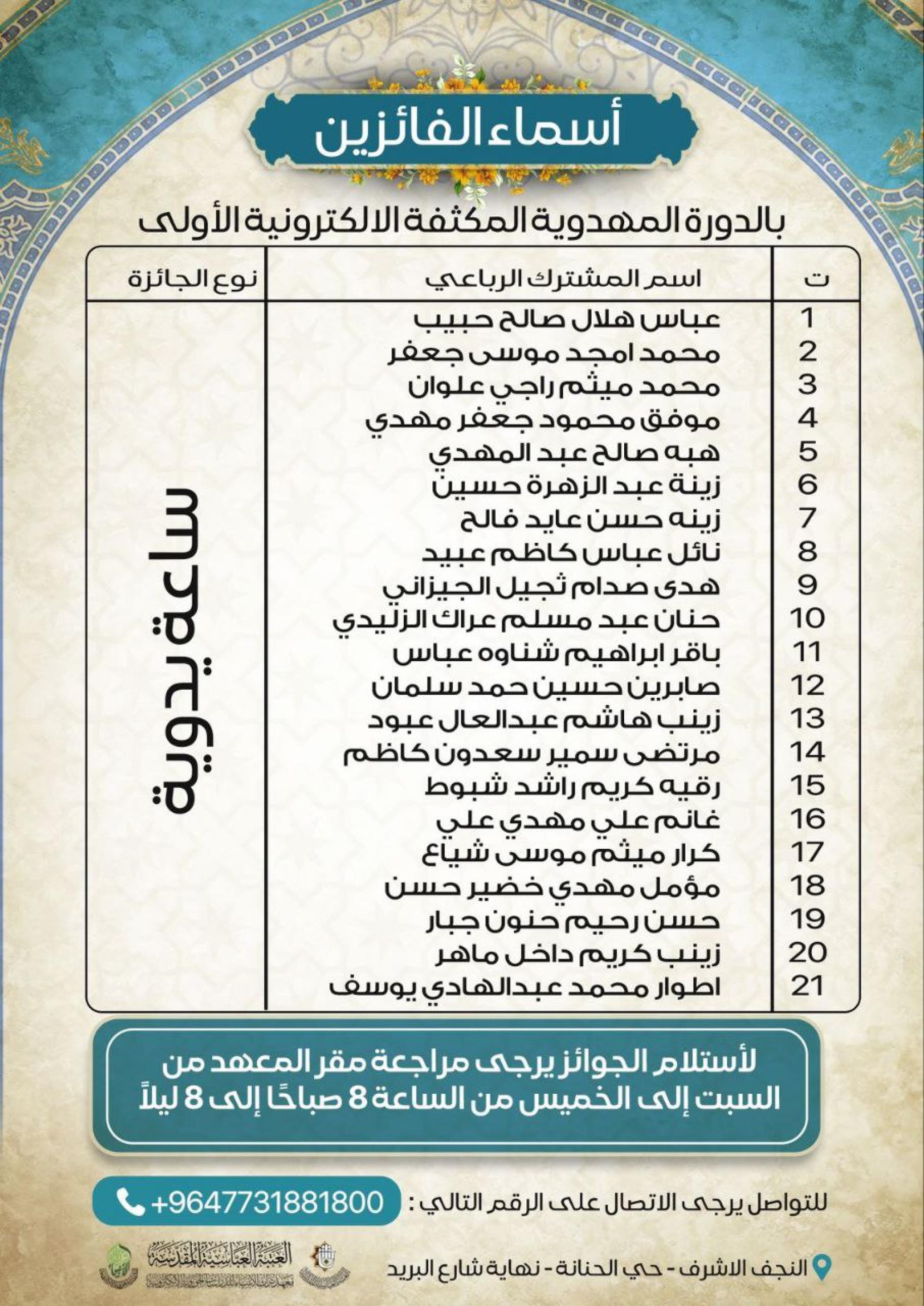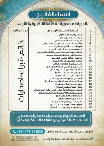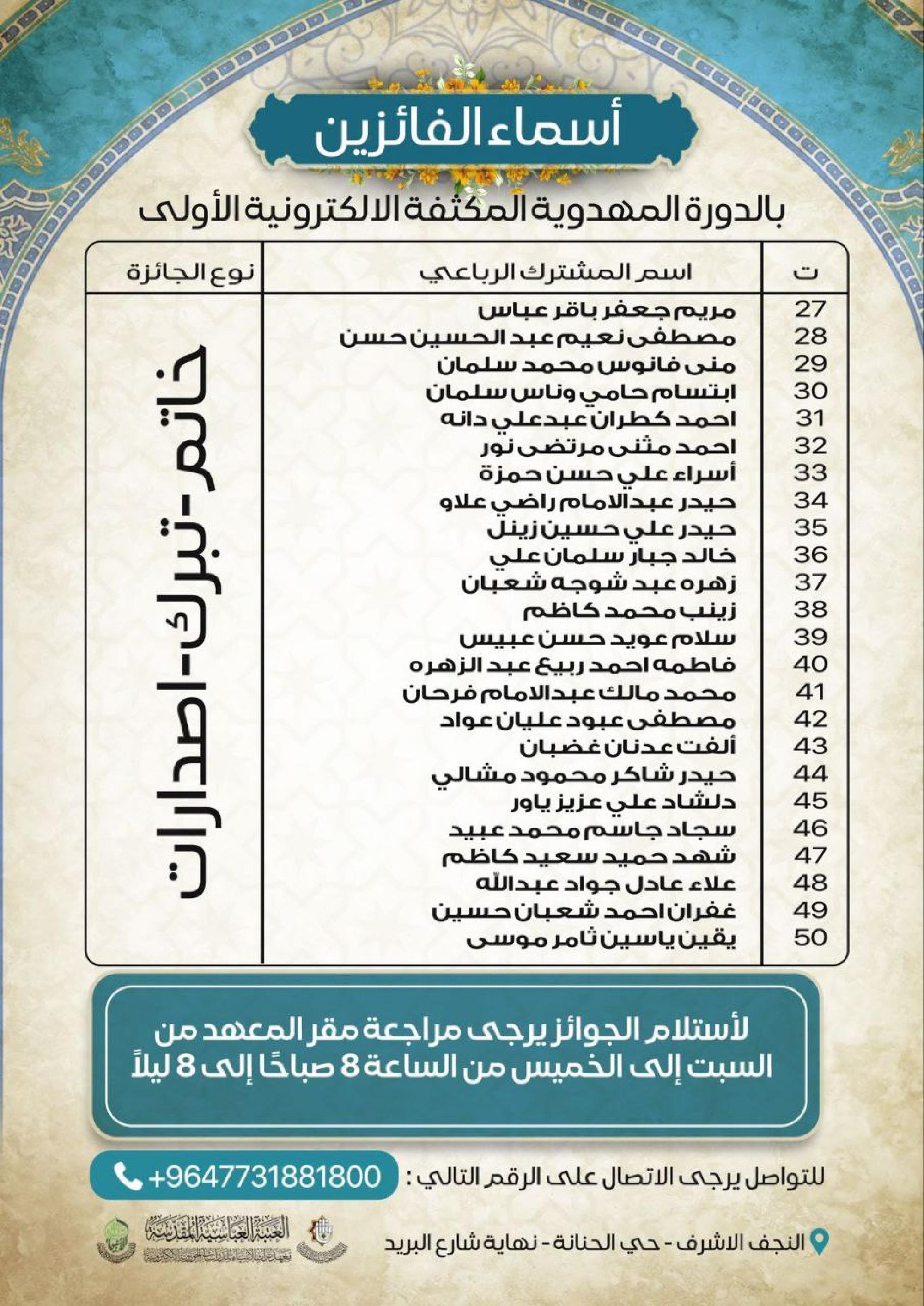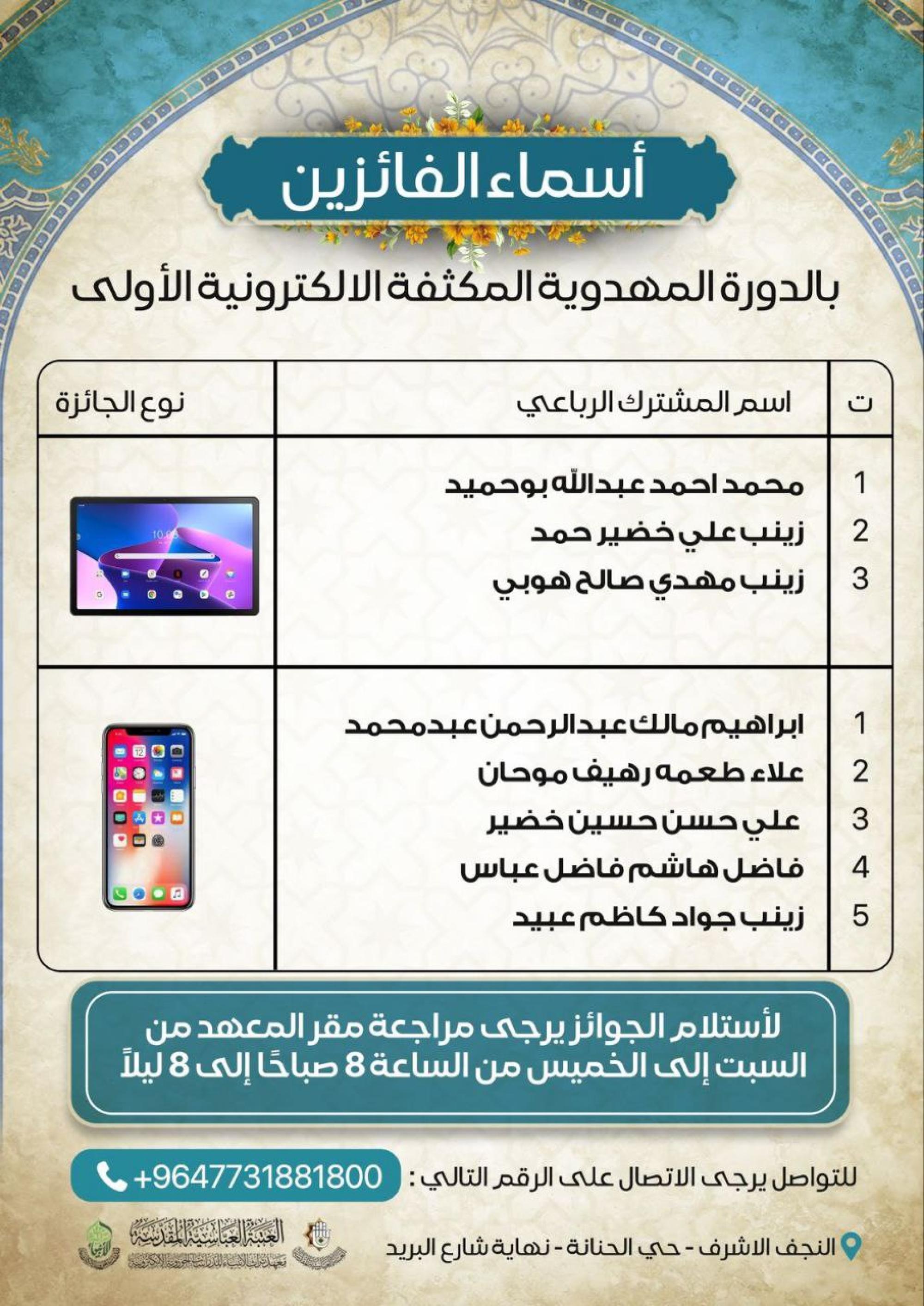 لاستلام الجوائز، مراجعة مقر المعهد الكائن في النجف الأشرف حي الحنانة نهاية شارع البريد، لجميع أيَّام الأسبوع عدا يوم الجمعة من الساعة الثامنة صباحًا وحتى الثامنة ليلًا.