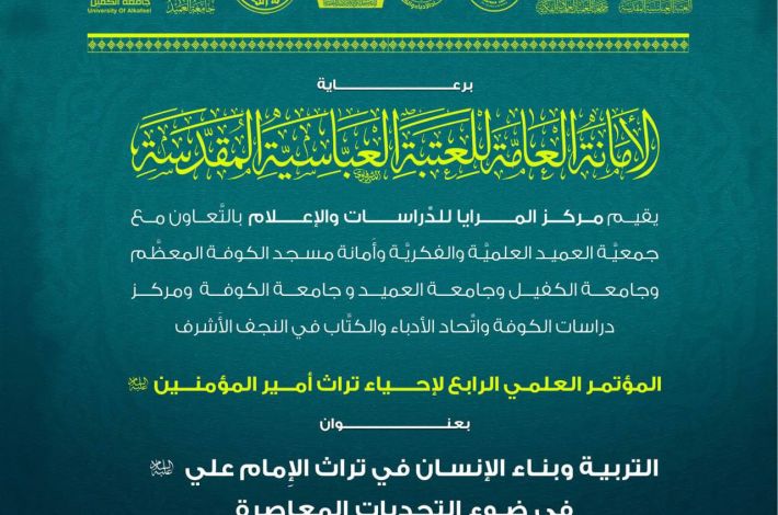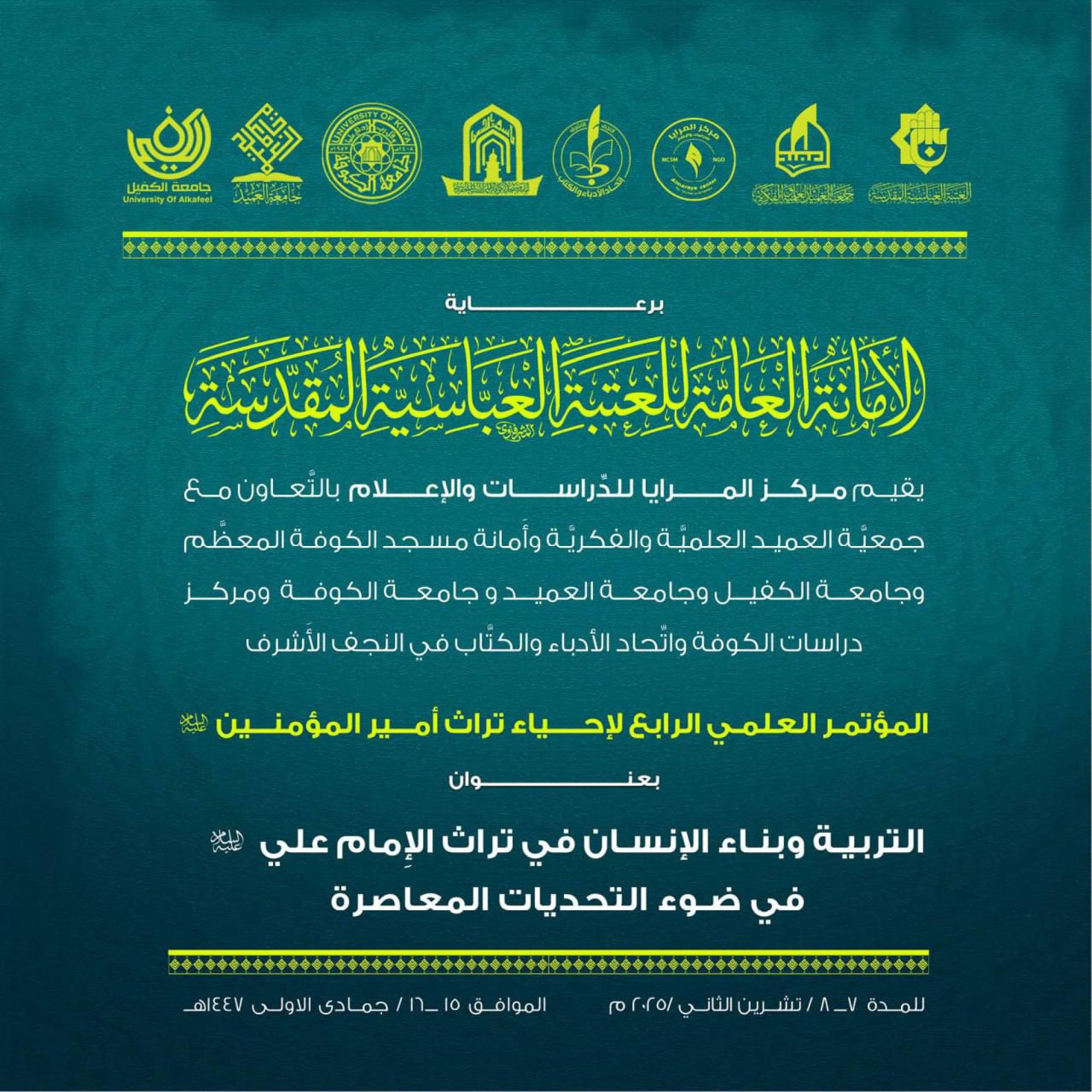 وسيعقد المؤتمر بعنوان: "التربية وبناء الإنسان في تراث الإِمام علي (عليه السَّلام) في ضوء التحدِّيات المعاصرة"، للمدَّة من 7- 8/تشرين الثاني/ 2025م – الموافق 15- 16/ جمادى الأولى 1447هـ.