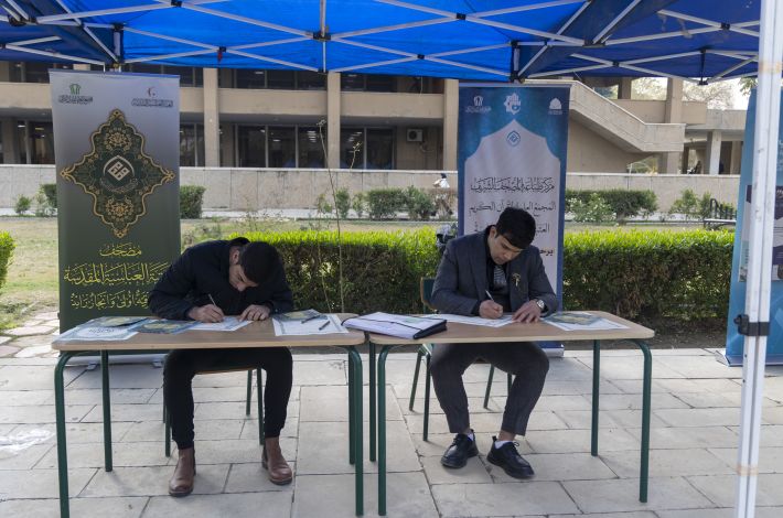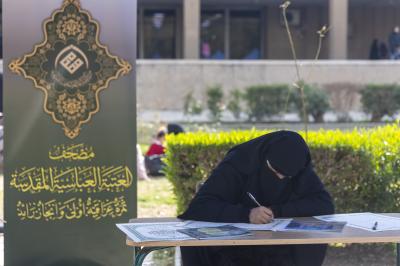 افتتح المجمع العلمي للقرآن الكريم في العتبة العباسية المقدسة محطة لخط المصحف الشريف ضمن فعاليات مهرجان السبط المنتظر في جامعة بغداد.
