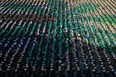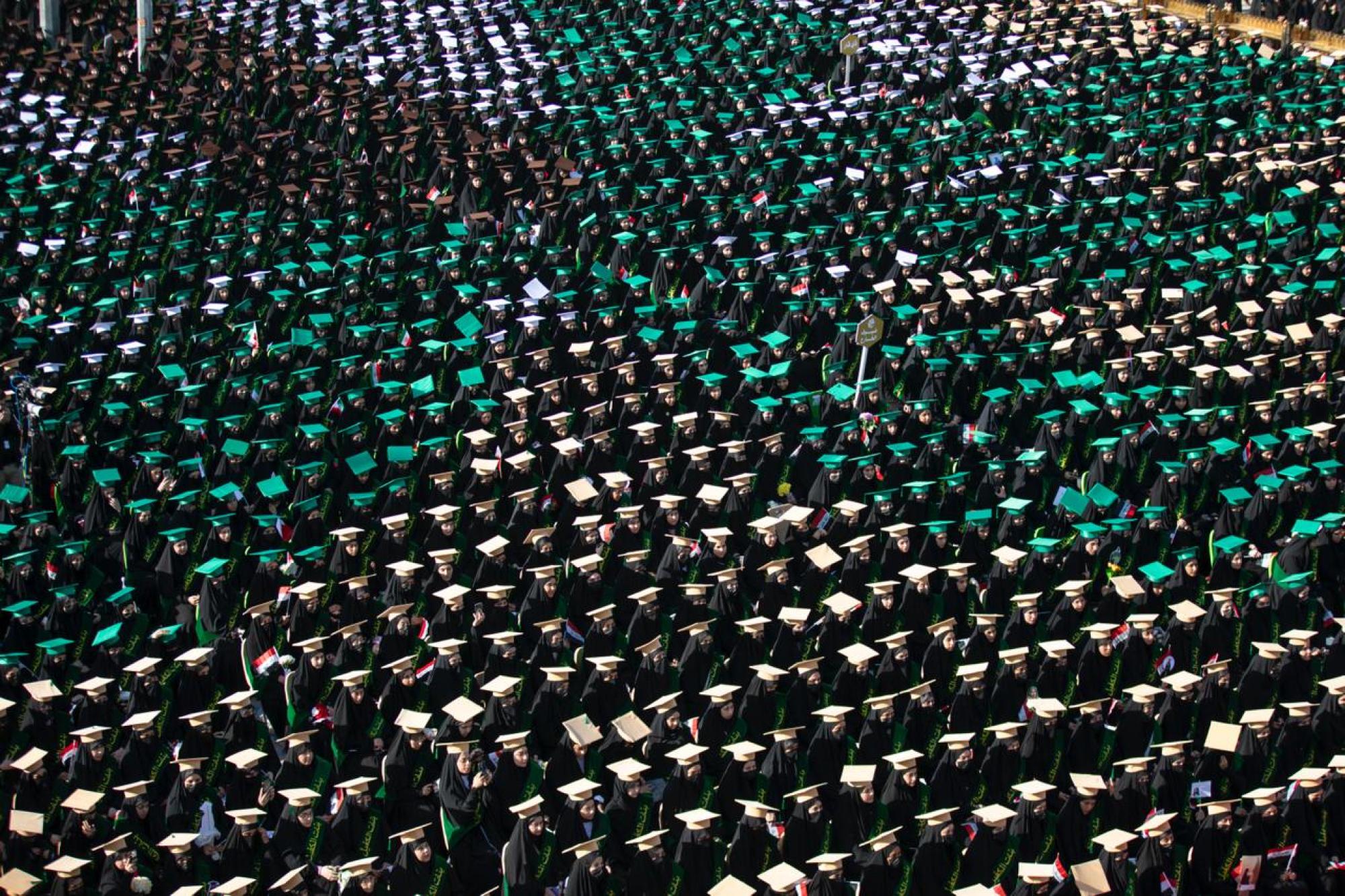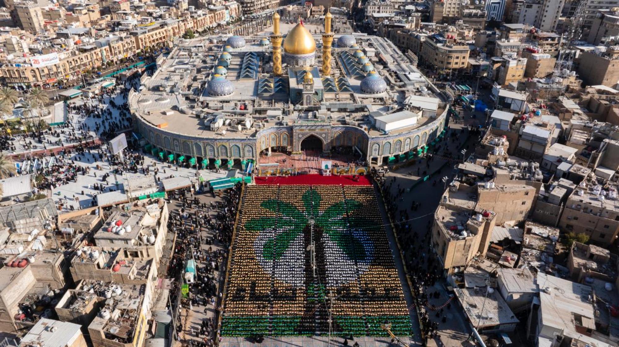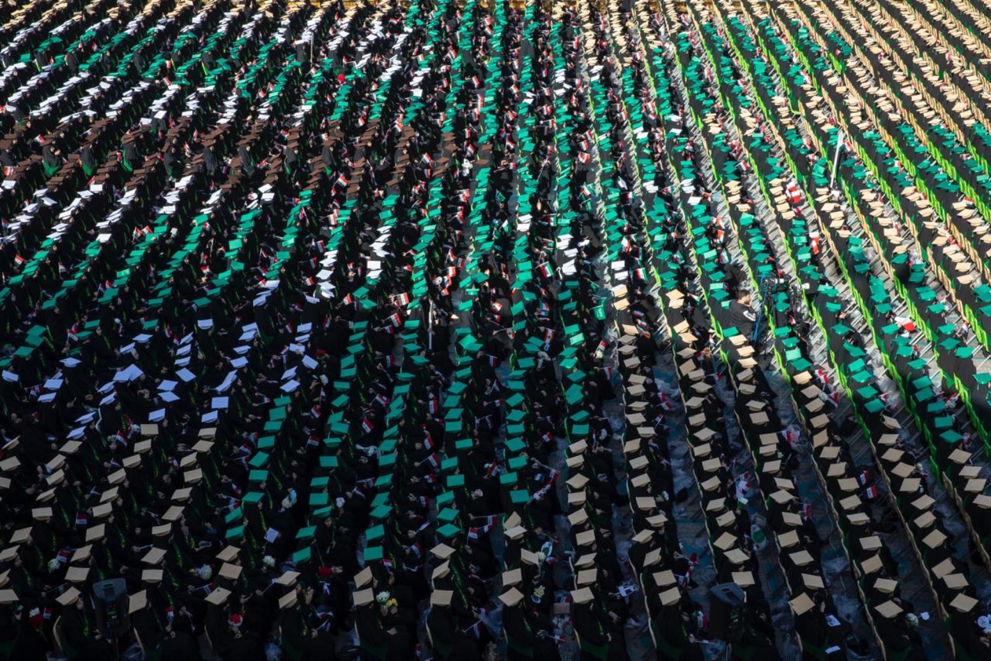 وجسَّدت طريقةُ الجلوس عند باب قبلة مرقد أبي الفضل العباس (عليه السلام)، رسمة النخلة العراقية عبر تنظيم وترتيب مقاعد جلوس الطالبات وألوان قبعات التخرج الخاصة بهنَّ.