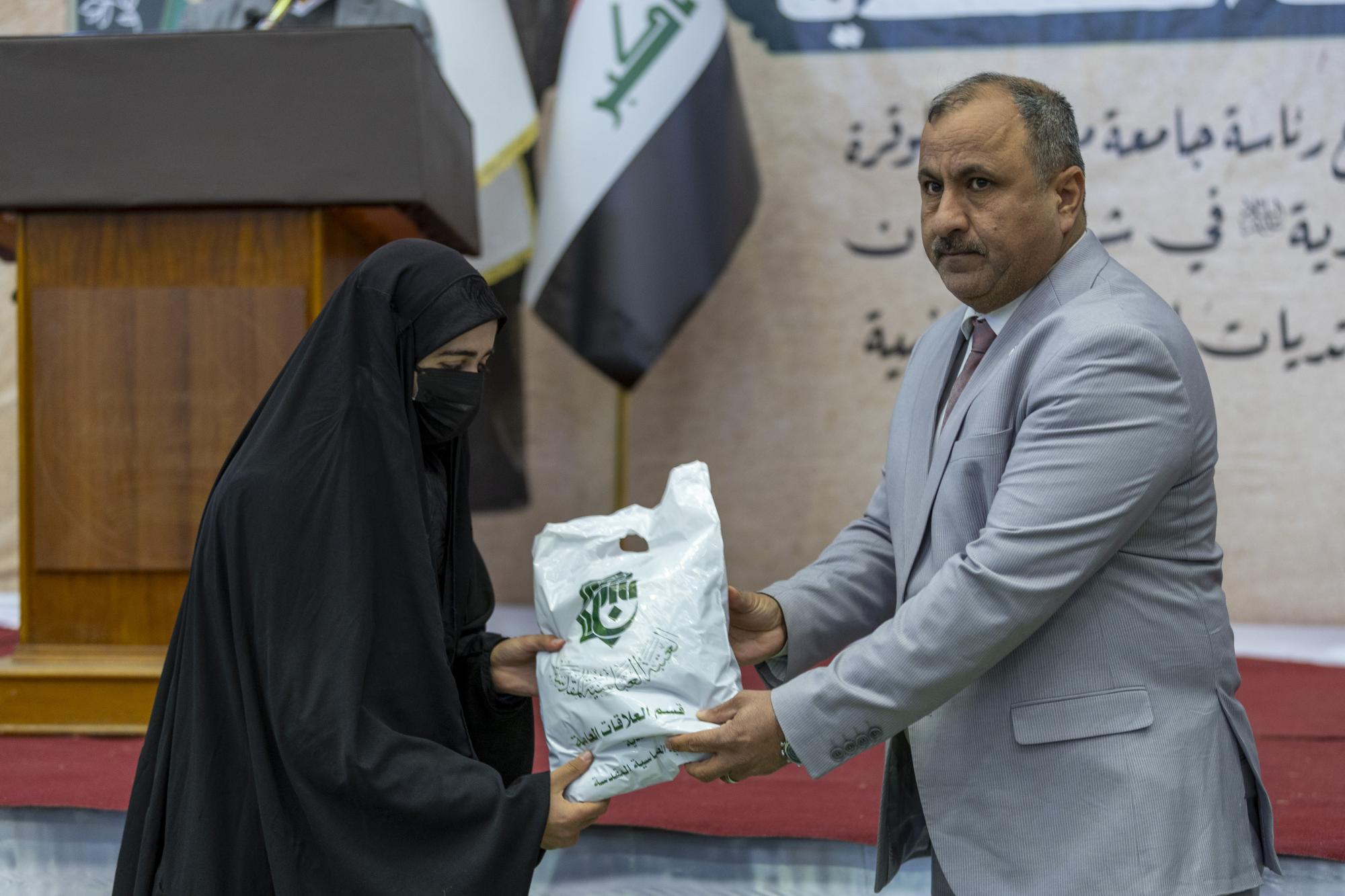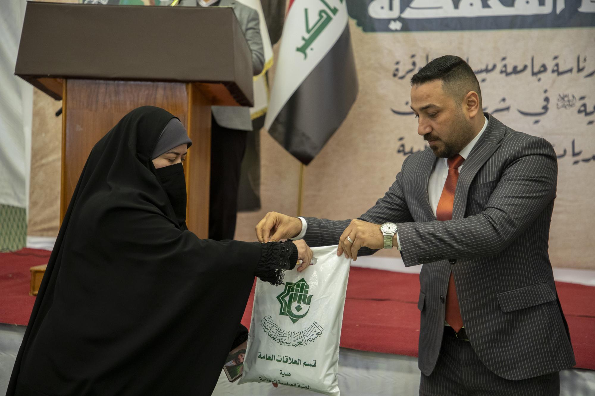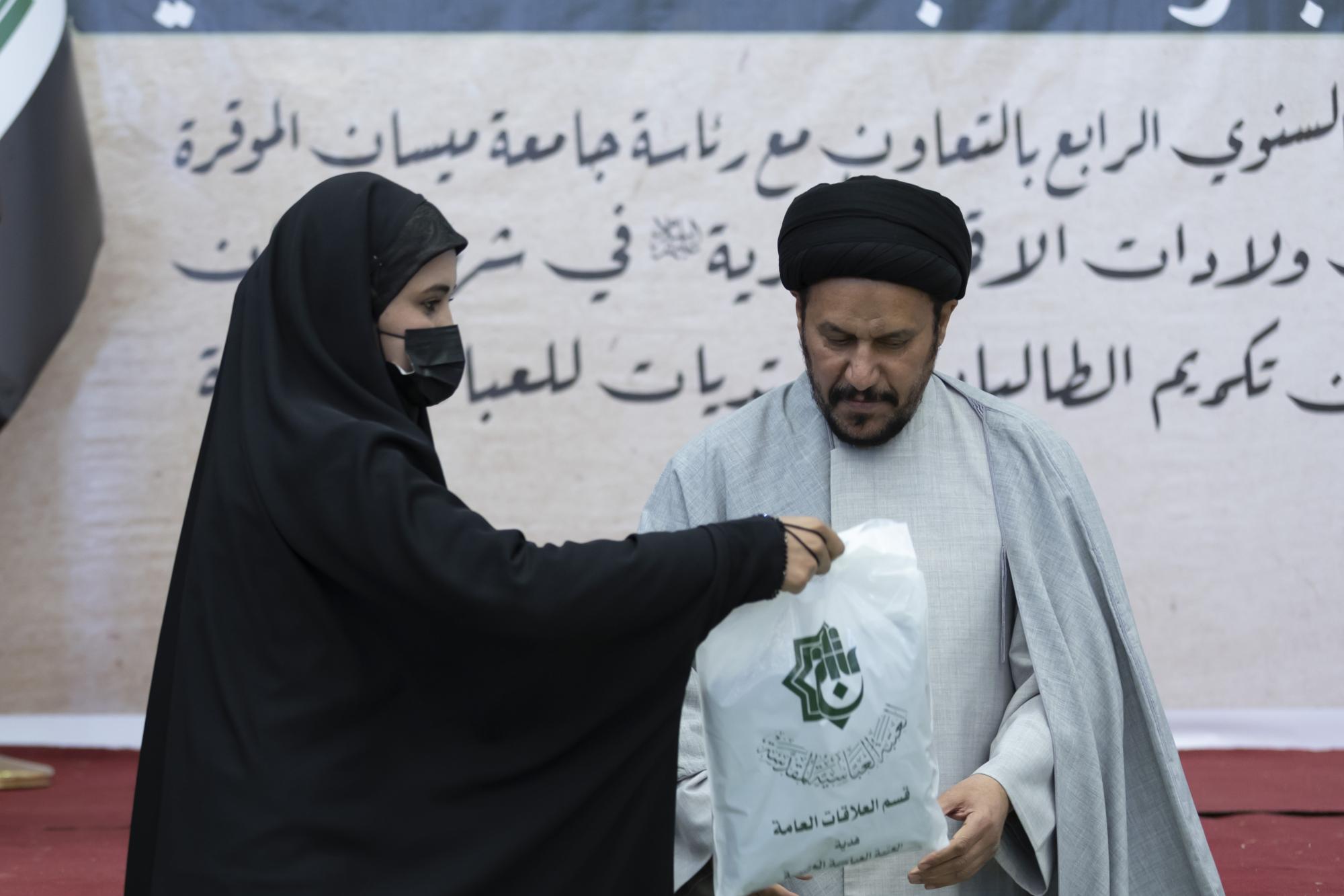 Der Sektionsleiter für Universitäts- und Schulbeziehungen der Abteilung, Herr Maher Khalid, sagte: "Der Heilige Abbassitische Schrein hielt das vierte jährliche "Asbat Mohammadiyah Festival an der Maysan Universität ab, das die Einrichtung mehrerer Abschnitte beinhaltete, einschließlich der Ehrung von mehr als 500 Studentinnen, die die irakische Abaya trugen"
