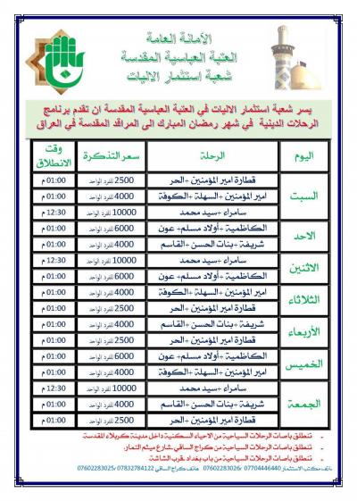 تتواصل شعبة استثمار الآليات في العتبة العباسية المقدسة، بتوفير سيارات مختلفة السعة لنقل الزائرين الكرام من داخل وخارج محافظة كربلاء الى العتبات المقدسة والمزارات الشريفة في عموم المحافظات العراقية وبالتزامن مع شهر رمضان المبارك أصدرت الشعبة برنامج لهذه الزيارات وبكلف مادية يسيرة , وللاستفسار يمكن زيارة مقر الشعبة الواقع في مجمع الامام العسكري ( عليه السلام )/ فندق الدلة سابقاً – أو الاتصال على الرقم هـ 07704446440 و 07602283026 وحسب ما مبين في الجدول التالي :