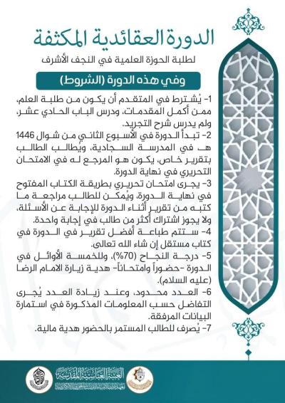 2- تبدأ الدورة في الأسبوع الثاني من شوال 1446 هـ، في المدرسة السجادية، ويُطالب الطالب بتقرير خاص، يكون هو المرجع له في الامتحان التحريري في نهاية الدورة.