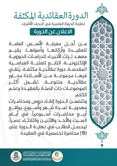 أعلن معهد تراث الأنبياء للدراسات الحوزوية الإلكترونية في العتبة العباسية المقدسة عن افتتاح التسجيل للدورة العقائدية المكثَّفة المخصَّصة لطلبة الحوزة العلمية في النجف الأشرف.
