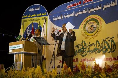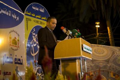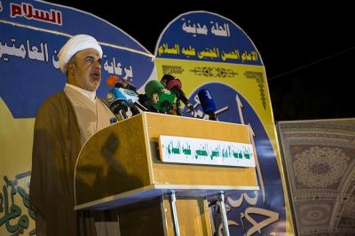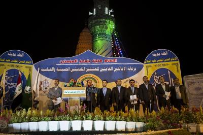 مبيّناً: "هذا المكانُ يجتمع فيه على مدى أعوام شيعةُ أهل البيت(عليهم السلام)، من هذه المدينة الكريمة مدينة الإمام الحسن المجتبى(عليه السلام) مدينة العلماء الحلّة الفيحاء ليحتفلوا بميلاد إمامهم، فنقول لهم نحن إخوانكم خدم أبي عبدالله الحسين وخدم أبي الفضل العباس(عليهما السلام) جئنا نشارككم هذا الحفل وجئنا نشدّ على أيديكم لهذه النشاطات ونبارك لكم هذه الجهود ونقول بلسانٍ فصيحٍ ونخاطب به إمامنا الحسن المجتبى نقول: سيدنا أبا محمد لقد جاء أخواك الحسين وأبو الفضل العباس(عليهما السلام) متمثّلين بخدّامهم الى الحلّة لكي يحتفلوا مع أهلها بهذه المناسبة، نحن نبارك لكم هذا العيد الكريم في هذا الشهر الفضيل، ونسأل الله سبحانه وتعالى أن يجعلكم في تواصلٍ دائمٍ مع مواليد أئمّتكم ونحن معكم وفي خدمتكم في أيّ وقتٍ وفي أيّ مكان، ونسأل الله سبحانه وتعالى لكم التوفيق بأن تجلّلوا هذه الخدمات وهذه النشاطات في سجلّ أعمالكم بثوابٍ جزيل".