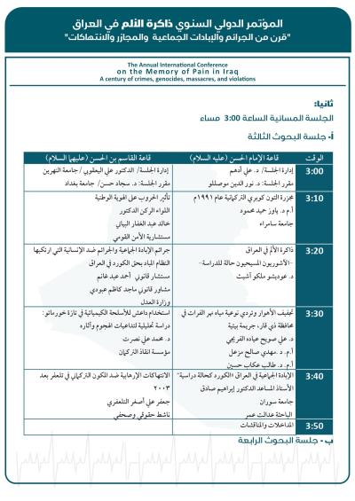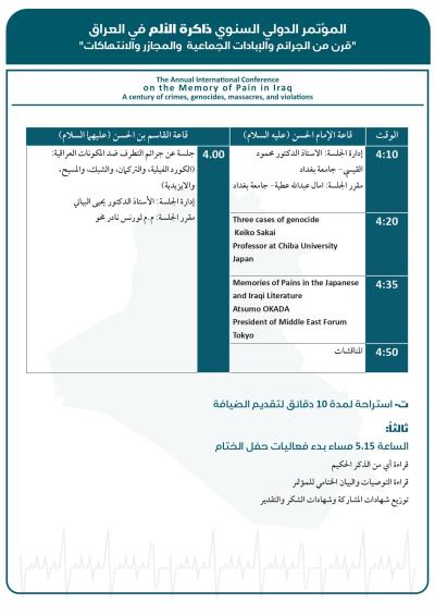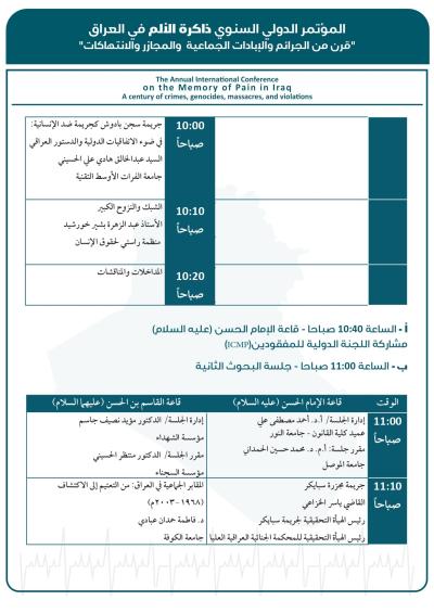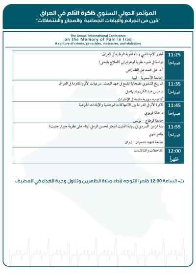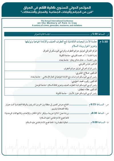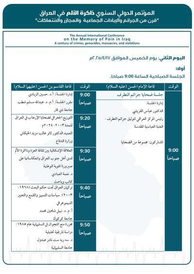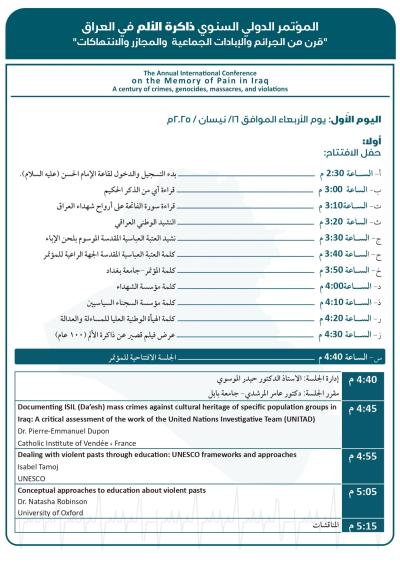 وسيُقام المؤتمر برعاية العتبة العبّاسية المقدّسة، وبعنوان: (ذاكرة الألم في العراق: قرنٌ من الجرائم والإبادات الجماعية والمجازر والانتهاكات)، في مدينة كربلاء المقدّسة، بالتعاون بين كرسي اليونسكو لدراسات منع الإبادة الجماعية في كلّية الآداب - جامعة بغداد، والمركز العراقيّ لتوثيق جرائم التطرُّف التَّابع لقسم الشُّؤون الفكريَّة والثقافيَّة في العتبة المقدَّسة، ومؤسَّسة الشهداء، ومؤسَّسة السجناء السياسيّين، والهيأة الوطنيَّة العُليا للمساءلة والعدالة.