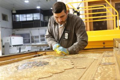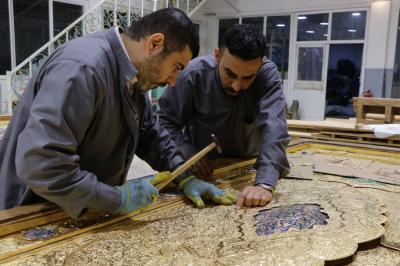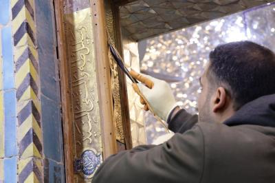 وأضاف أنّ الأعمال تضمّنت تفكيك الباب من موقع المزار ونقل أجزائه إلى مقر القسم، لإجراء صيانة للقطع المعدنية المتضررة وإعادة طلائها بمعدن الذهب، إلى جانب صيانة الهيكل الخشبي للباب.