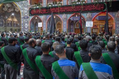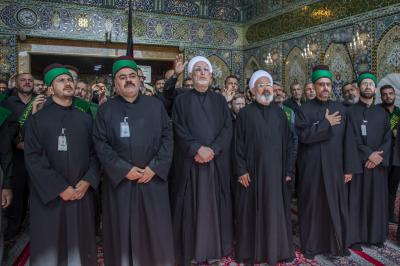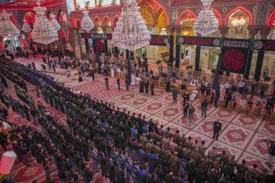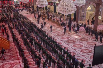 The procession set off from the shrine of Aba al-Fadl al-Abbas (peace be upon him), passing through the square between the Two Holy Shrines, and reaching the shrine of Imam al-Hussayn (peace be upon him) to extend the condolences to him on this sad occasion, as the mourners in their march echoed words that embodied feelings of sadness and sorrow, and showed the extent of the impact of this sad event on the souls of believers.