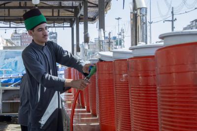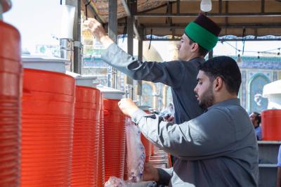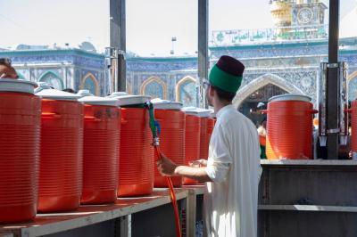 Le personnel de la Division des Serviteurs du Sanctuaire d'al-Abbas (p) offre ses services aux visiteurs du sanctuaire d'Aba al-Fadl al-Abbas (sur lui la paix) lors d'une procession de service pour le jour d'Arafa.