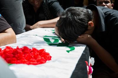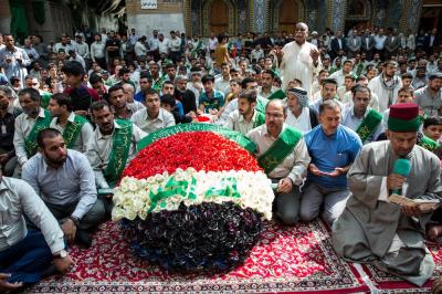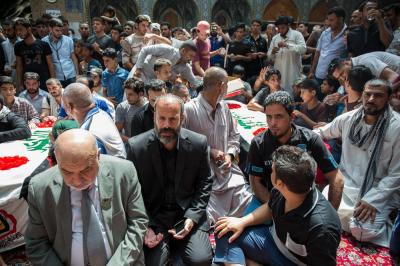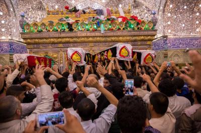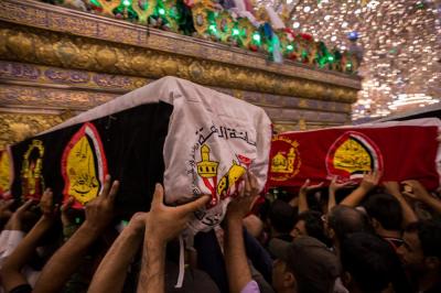 شھداء کی تشیع جنازہ میں حضرت امام حسین علیہ السلام اور حضرت عباس علیہ السلام کے روضہ مبارک کے خدام اور زائرین کی بڑی تعداد کے علاوہ ہزاروں مومنین نے شرکت کی۔