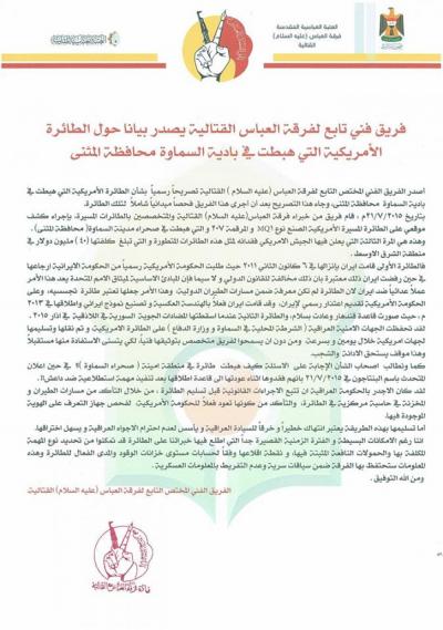 عباس عسکری یونٹ کی طرف سے جاری کردہ بیان میں عراق کے صوبہ مثنی کے صحراء میں گرنے والے امریکی جاسوسی طیارے کے بارے میں بتایا گیا ہے کہ 21 جولائی 2015 کو عباس عسکری یونٹ کو خبر ملی کہ صوبہ مثنی کے علاقے سماوہ کے صحراء میں ایک ڈرون جاسوسی طیارہ نظر آیا ہے جس کے بعد عباس عسکری یونٹ کے جہازوں کے مکینیکل ماہرین کی ایک ٹیم فوری طور پر وہاں پہنچی تو اس ڈرون طیارے کے مشاہدے سے معلوم ہوا کہ یہ امریکہ کا (MQ1) ساخت کا (207)نمبر طیارہ ہے۔