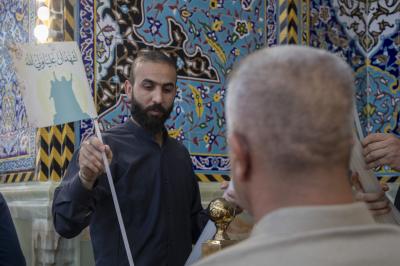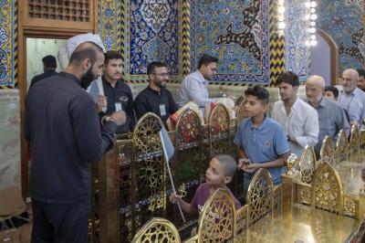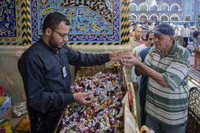 Die Diener des Schreins von Aba al-Fadl Al-Abbass (Friede mit ihm) verteilten Süßigkeiten an die Besucher und drückten damit ihre Freude und ihr Glück über diesen gesegneten Anlass aus.