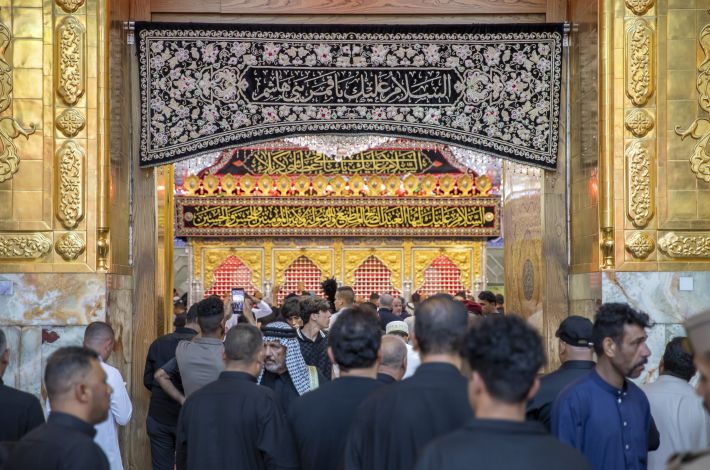 L'équipe a remplacé les rideaux qui ornaient les portes du sanctuaire par de nouveaux rideaux noirs, fabriqués dans un tissu durable et de haute qualité, brodés de phrases d'Achoura.