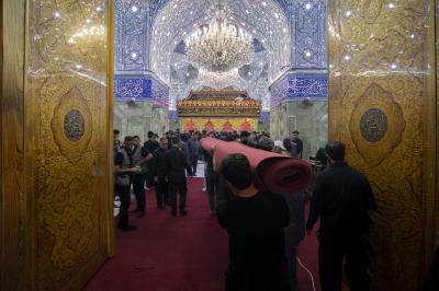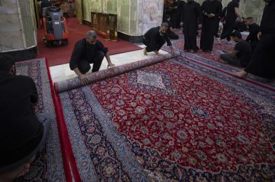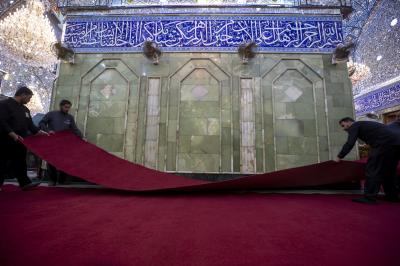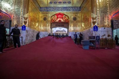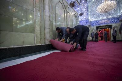 The department's staff completed the furnishing of the holy sanctuary with 1,080 square meters of red carpet as part of their preparations to welcome the mourning crowds with the arrival of the month of sorrow, and to provide the best services to the visitors of the pure sanctuary and the Hussaini mourning processions.