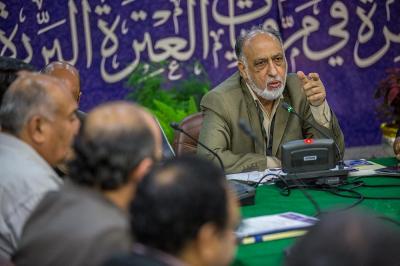 المحور الأوّل لهذه الورشة كان عن (أخلاق النبيّ محمد(صلى الله عليه وآله) في ضوء وصف الإمام علي(عليه السلام) في نهج البلاغة)، وقد أدارها الأستاذ الدكتور سرحان جفّات من جامعة القادسية وأحد الكوادر العاملة في مركز العميد الدوليّ للبحوث والدراسات، وسلّط الضوء على أمور عدّة تخصّ شخصية الرسول(صلى الله عليه وآله) وفقاً لرؤية الإمام علي(عليه السلام) عن طريق كتاب نهج البلاغة كشجاعة الرسول واستبساله في المعارك التي خاضها المسلمون وكيف كان هو الدرع الأوّل لجيوش المسلمين، عكس ما يُنقل من أنّه كان جالساً في خيمة أو يحتمي بـ"س" من الناس أو "ص"، كذلك تطرّق الدكتور جفّات لمواضيع وقضايا بعيدة كلّ البعد عن شخص الرسول الأعظم(صلى الله عليه وآله) والتي دحضتها خطبُ وأحاديث الإمام علي(عليه السلام) في كتاب نهج البلاغة.