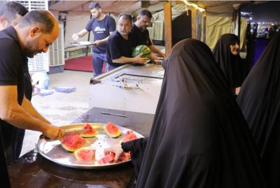 ويواصل الموكب الذي يُقام للعام السابع عشر على التوالي، وبدعم مباشر من إدارة العتبة المقدسة، تقديم وجبات الإفطار والغداء والعشاء، إضافة إلى العصائر الطبيعية والفواكه والمشروبات الباردة على مدار 24 ساعة، فضلاً عن أماكن للاستراحة والصلاة.