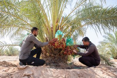 تواصل ملاكات قسم المشاريع الهندسية في العتبة العباسية المقدسة جني محصول التمور من نخيل مزرعة الساقي.