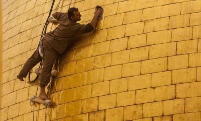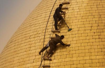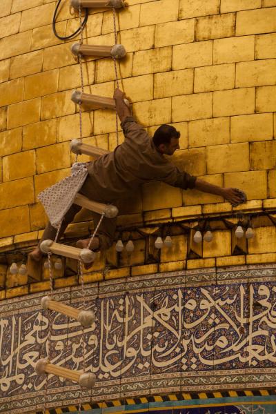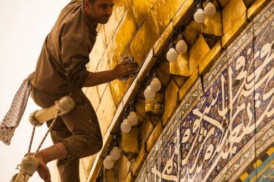 Usually the cleaning is done after the summer and the end of the dust storm season. and because these climatic fluctuations and the weather conditions have an impact on the work of cleaning the golden tiles covering the domes and two minarets, they are carried out according to a special plan, dividing the dome to five sections during the cleaning, each day, one section is cleaned, and once all of them are completely cleaned, the cleaning works start at the minarets, using special cleaning material and equipment that do not affect the gold tiles, and using a cotton piece of cloth to dry the tiles, as if left without being dried, sediments stick to them, in form of calcifications that reduce the glitter and shine of the holy dome. All of which is undertaken respecting the time factor and the accuracy in work. The first phase included the cleaning of the holy dome for the eastern side of the Euphrates Gate (Al-'Alqami) counterclockwise and from top to bottom, i.e from the holy flag to the base of the dome, followed by the cleaning of the minarets.