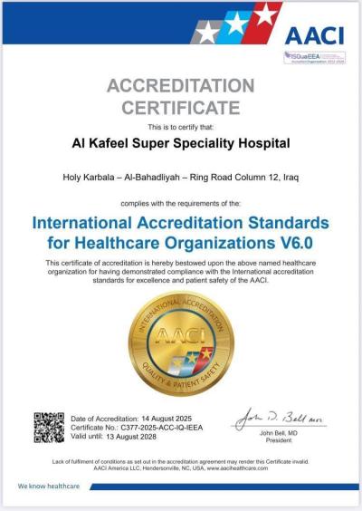 وقال مدير المستشفى، الدكتور جاسم الإبراهيمي: إنّ المستشفى حصل على شهادة الاعتماد الدولية الصادرة من مؤسسة (AACI) الأمريكية، لكون جودة خدماتنا تتطابق مع معايير الاعتماد الدولية لمؤسسات الرعاية الصحية الخاصة بالتميز وسلامة المرضى.