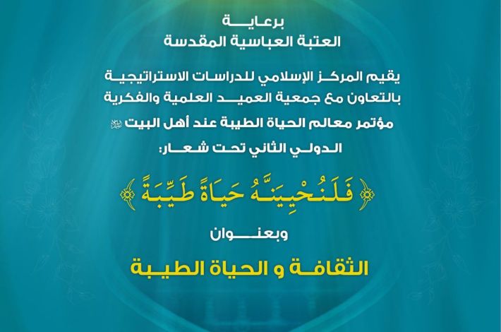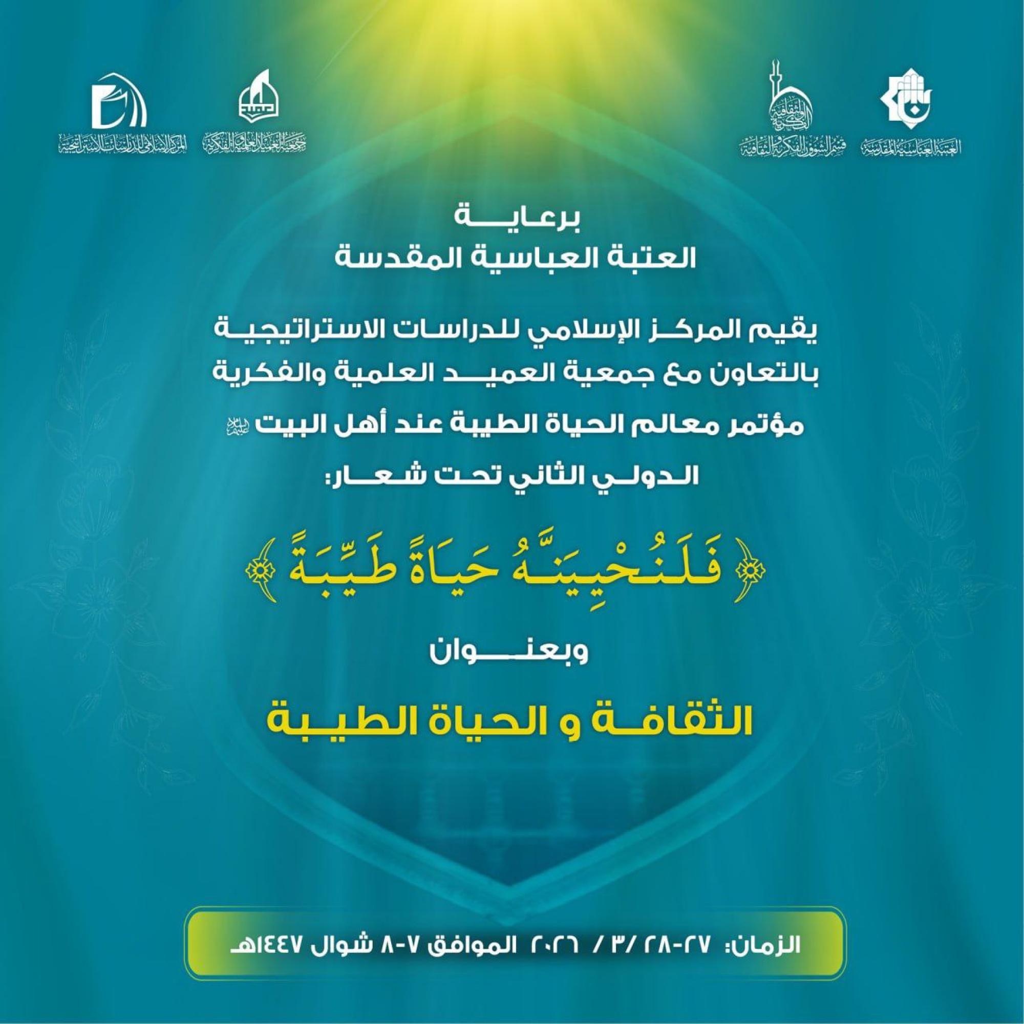 ويقيم المؤتمر المركز الإسلامي للدراسات الاستراتيجية التابع لقسم الشؤون الفكرية والثقافية في العتبة المقدسة، بالتعاون مع جمعية العميد العلمية والفكرية، تحت شعار: (فلنحيينه حياة طيبة)، وذلك للمدة من (27 – 28 آذار 2026م) الموافق (7 – 8 شوال 1447هـ).