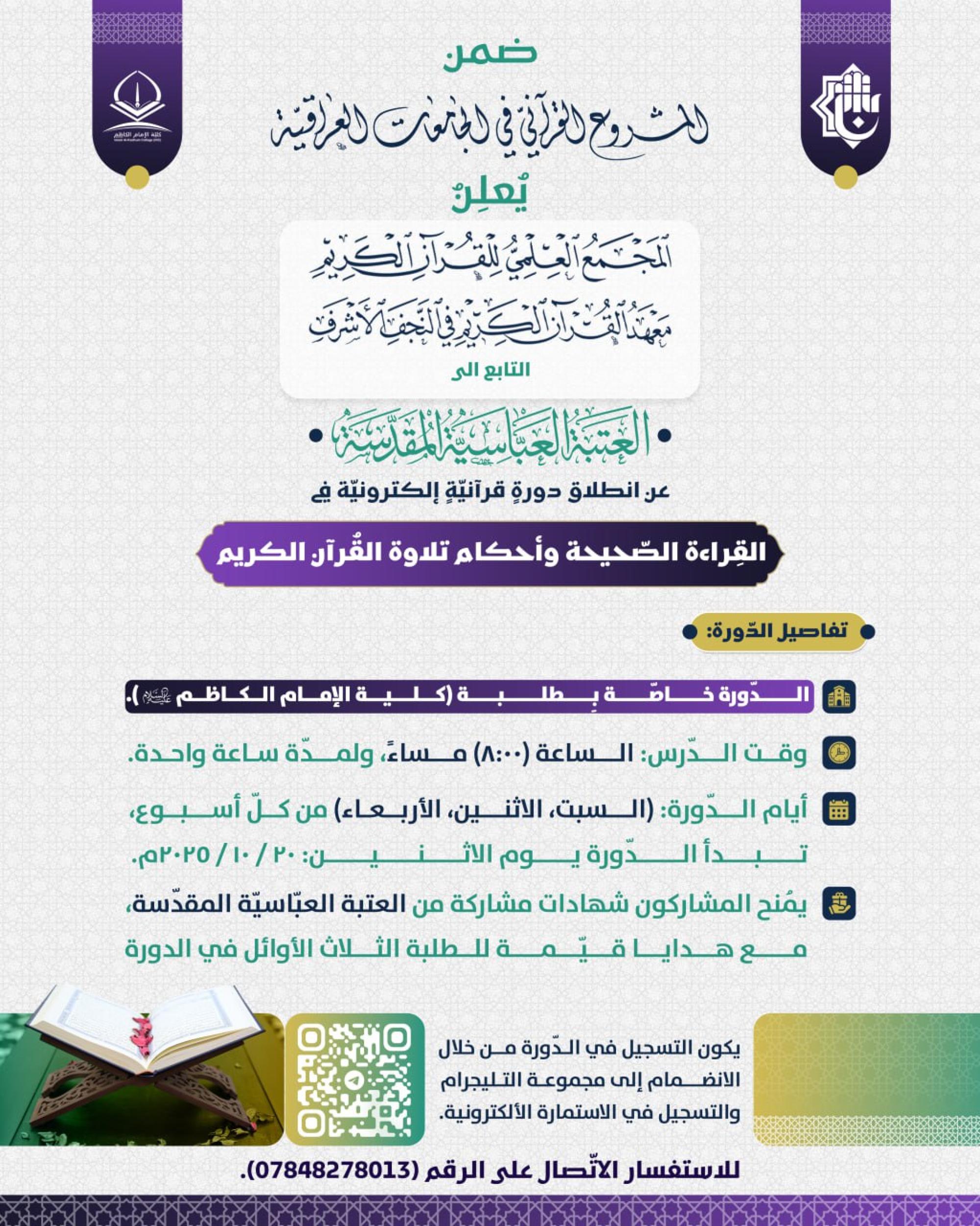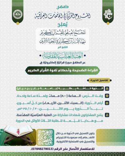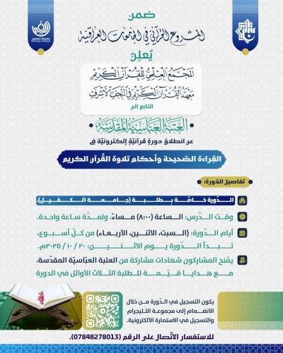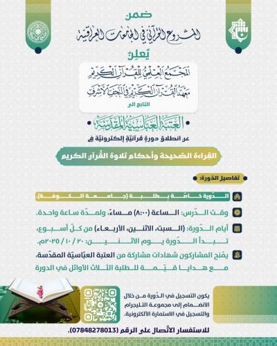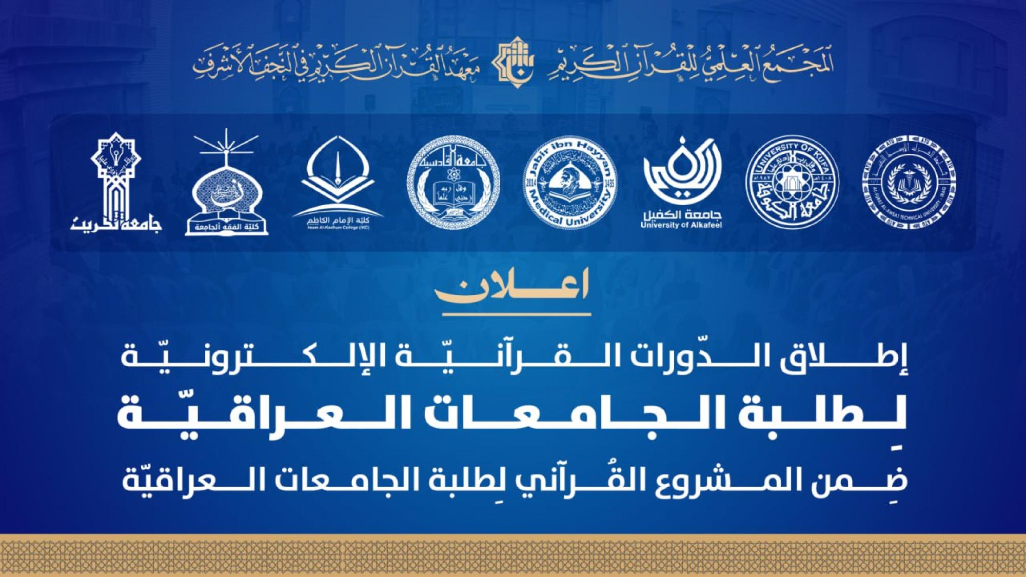 أطلق المَجمَعُ العلميّ للقرآن الكريم في العتبة العبّاسية المقدّسة، الدورات القرآنية الإلكترونية لطلبة الجامعات العراقيّة، ضمن المشروع القرآنيّ لطلبة الجامعات.