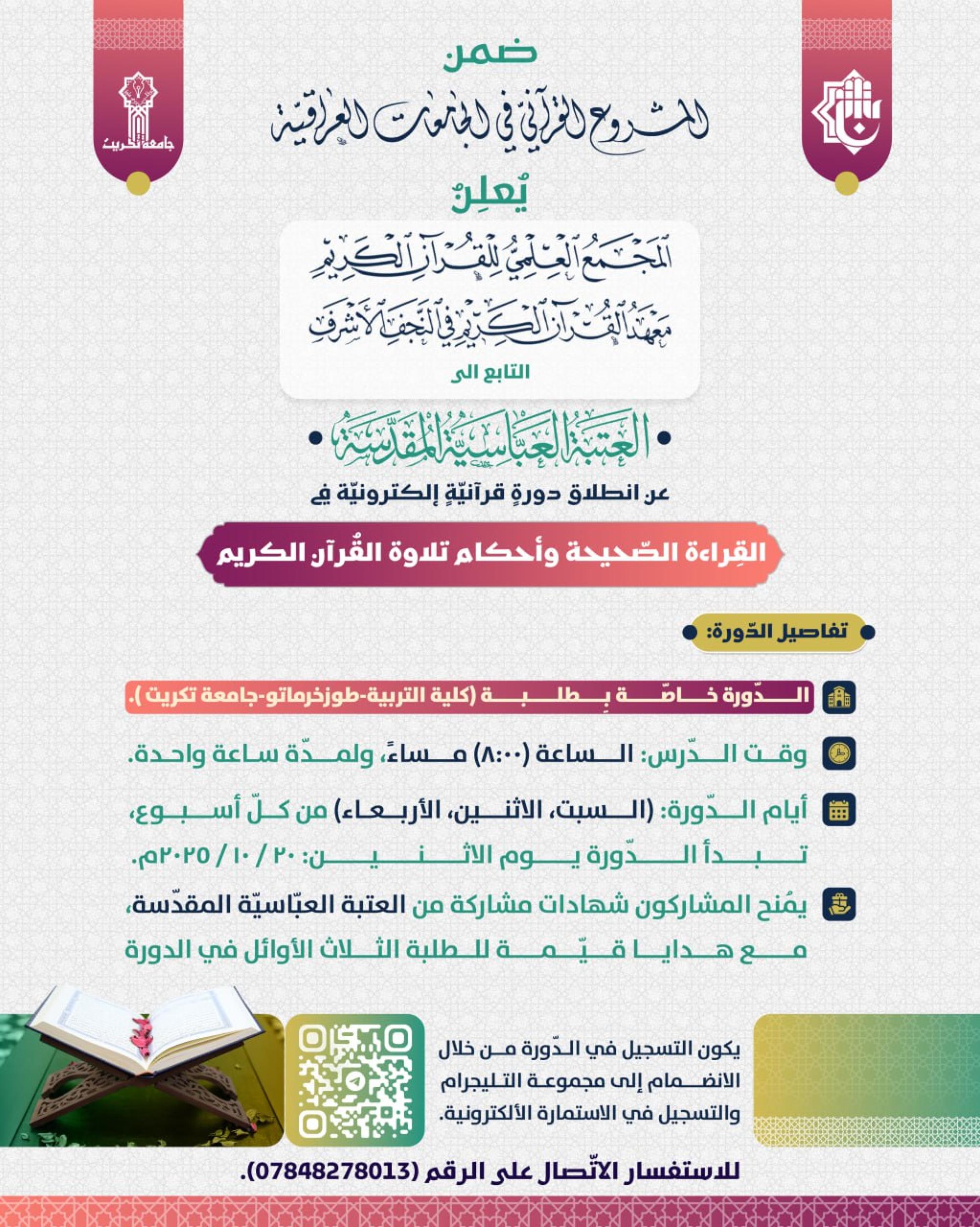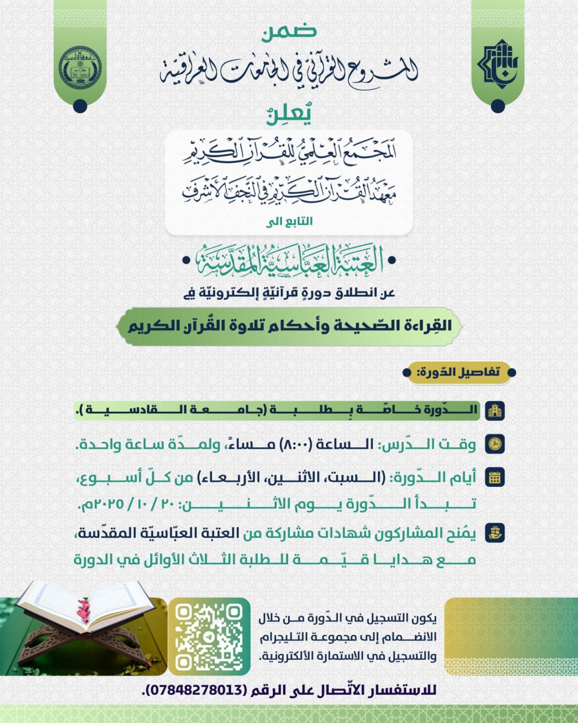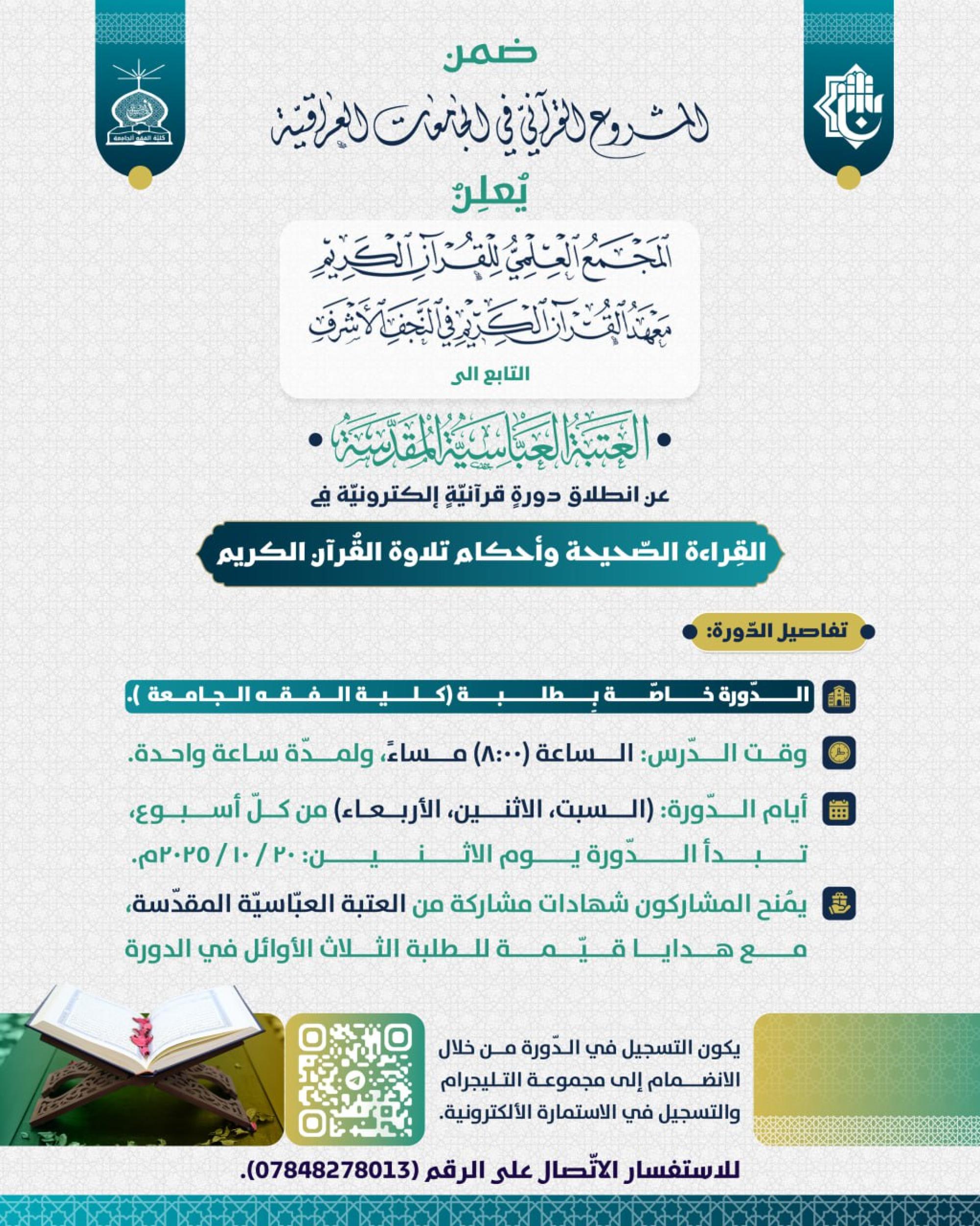 أطلق المَجمَعُ العلميّ للقرآن الكريم في العتبة العبّاسية المقدّسة، الدورات القرآنية الإلكترونية لطلبة الجامعات العراقيّة، ضمن المشروع القرآنيّ لطلبة الجامعات.