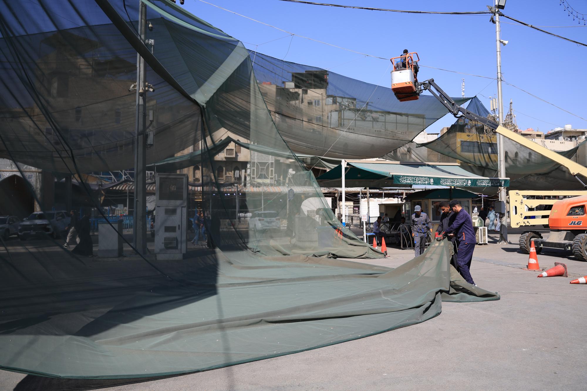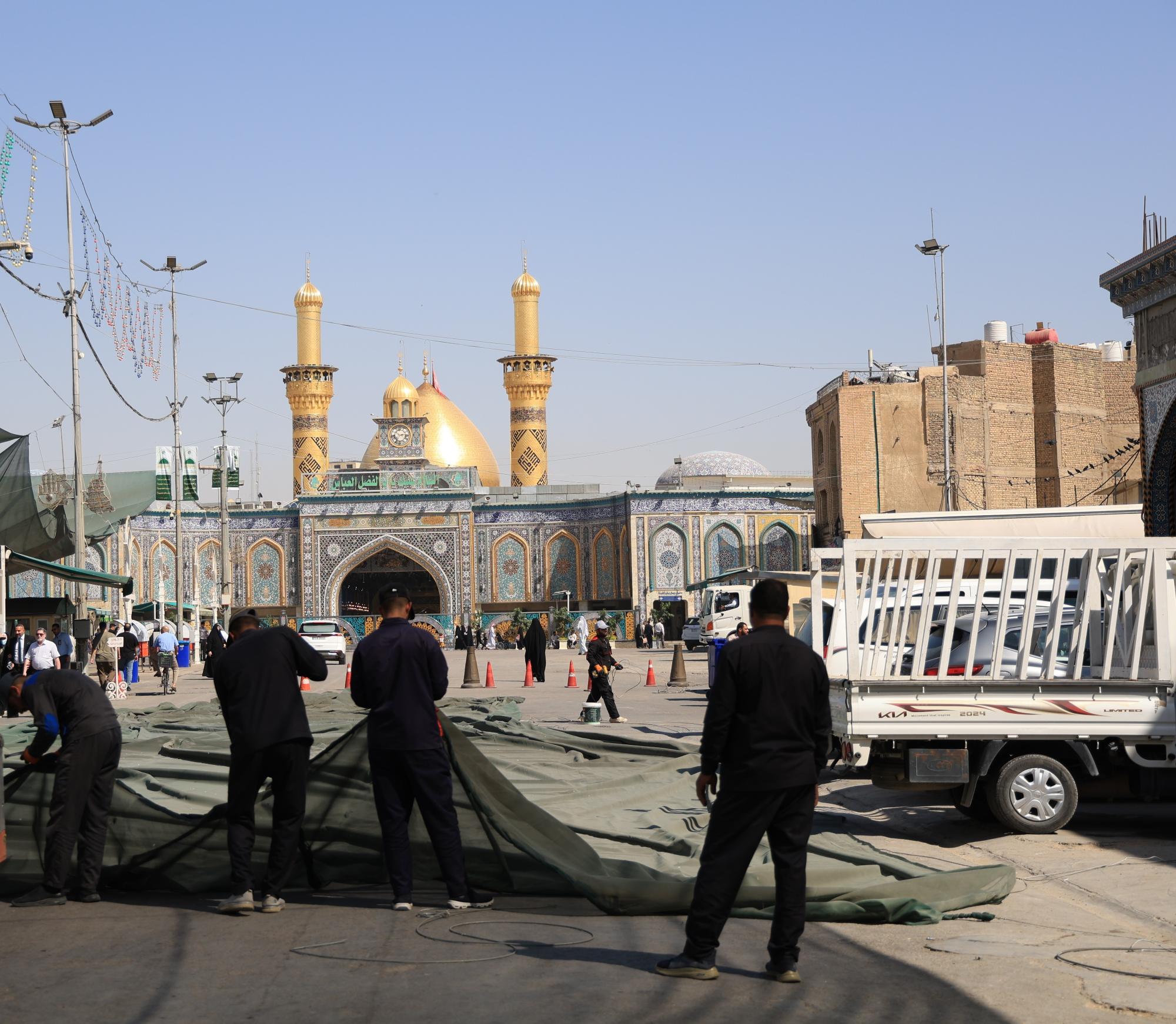 باشر قسم الصيانة والإنشاءات الهندسية في العتبة العباسية المقدسة بأعمال رفع قماش الساران من الشوارع المؤدية إلى مرقد أبي الفضل العباس (عليه السلام).