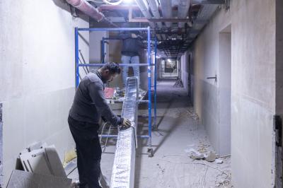 وقال المشرف على الأعمال المدنية في المشروع، المهندس زيد حميد: إنّ "الأعمال الحالية تتضمّن استمرار تمديد مجاري الهواء (الدكتات) الخاصّة بمنظومة التبريد المركزي، وذلك في غرف الرقود والممرات والأقسام المختلفة من المستشفى".