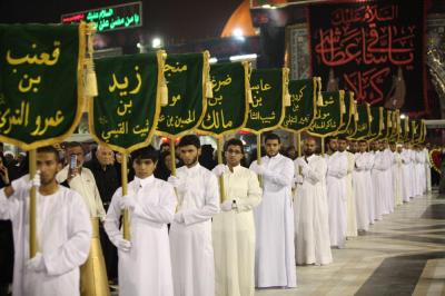كانت بدايةُ مسيرة هذا الموكب العزائيّ من صحن أبي الفضل العباس(عليه السلام) باتّجاه صحن الإمام الحسين(عليه السلام)، وقد انتظم المعزّون على شكل خطوطٍ متوازية وهم يحملون لافتاتٍ خضراء كُتِبَت عليها أسماءُ شهداء واقعة الطفّ الخالدة تتقدّمهم كوكبةٌ من حَمَلَة المصاحف الشريفة والأعلام.
