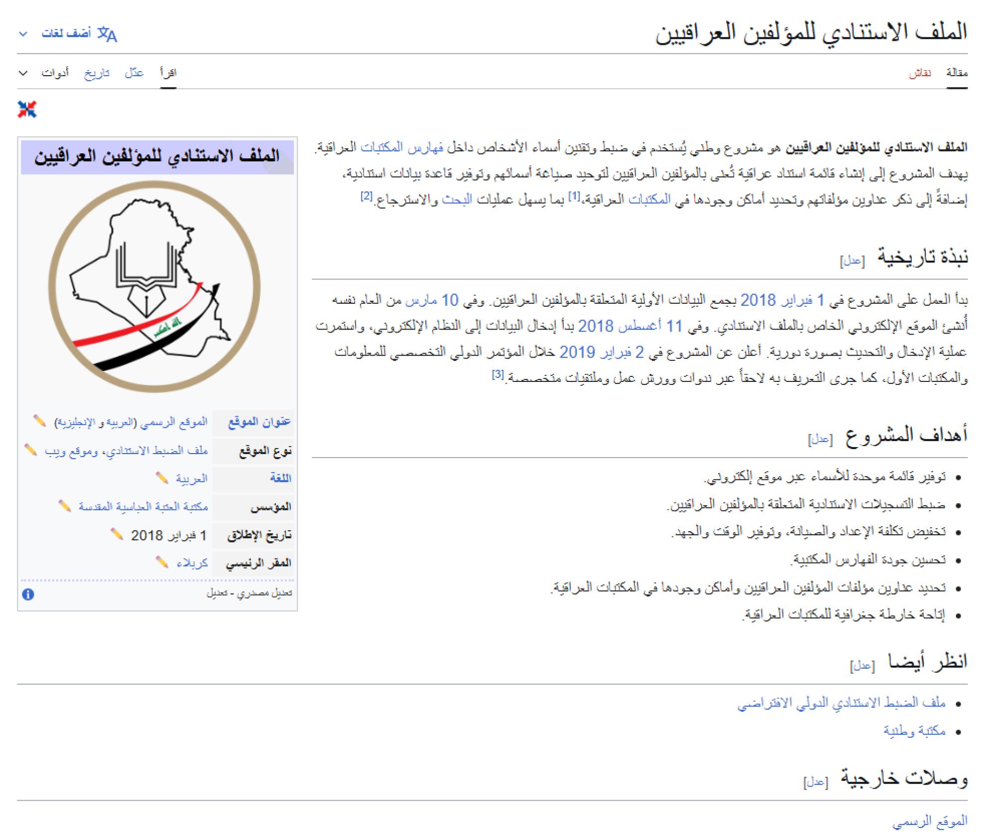 وأضاف أنَّ "مشروع الملف الاستنادي انطلق بهدف توثيق وضبط أسماء المؤلفين العراقيين وتسهيل الوصول إلى إنتاجهم الفكري عبر شبكة الإنترنيت، وقد أدرج المشروع سابقًا في منصة ويكي بيانات (Wikidata)، الأمر الذي شكل أساسًا لتعزيز حضوره الرقمي ومهَّد الطريق أمام ظهوره في موسوعة ويكيبيديا العالمية".