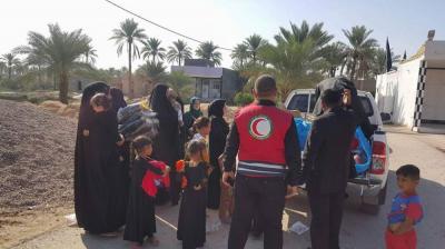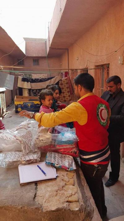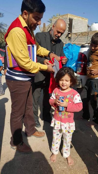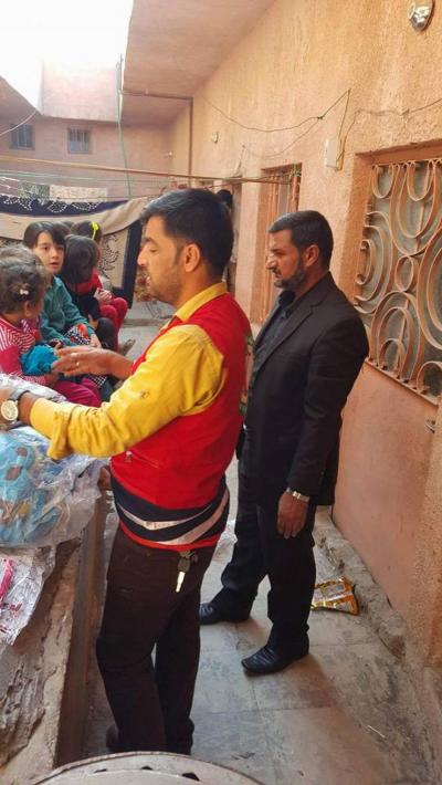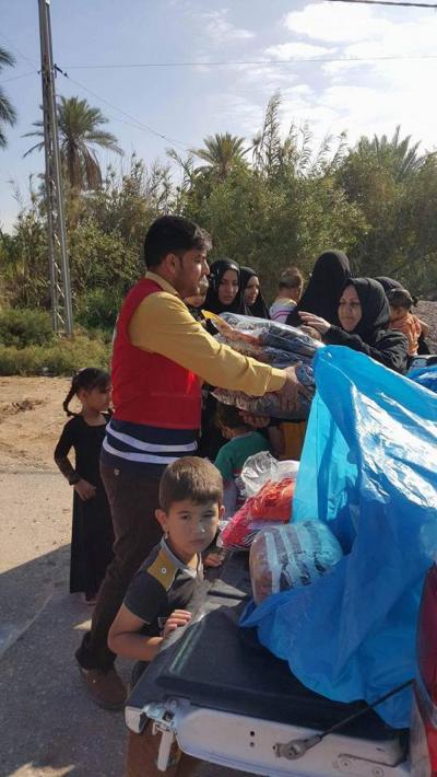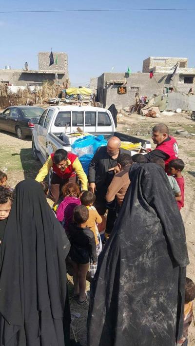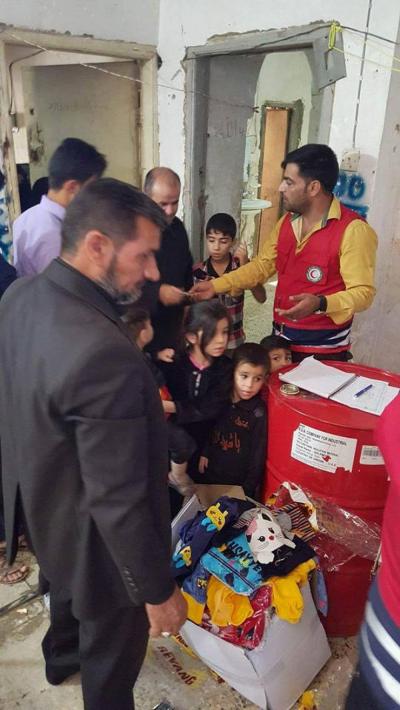 Le comité de secours au saint sanctuaire avec la coopération du croissant rouge à Karbala, la branche al-Hindia, distribue des vêtements chauds aux famille des réfugiés connus ( femmes et enfants) qui ont été obligés de quitter leurs habitations.