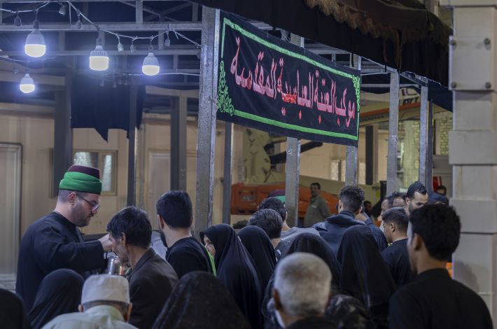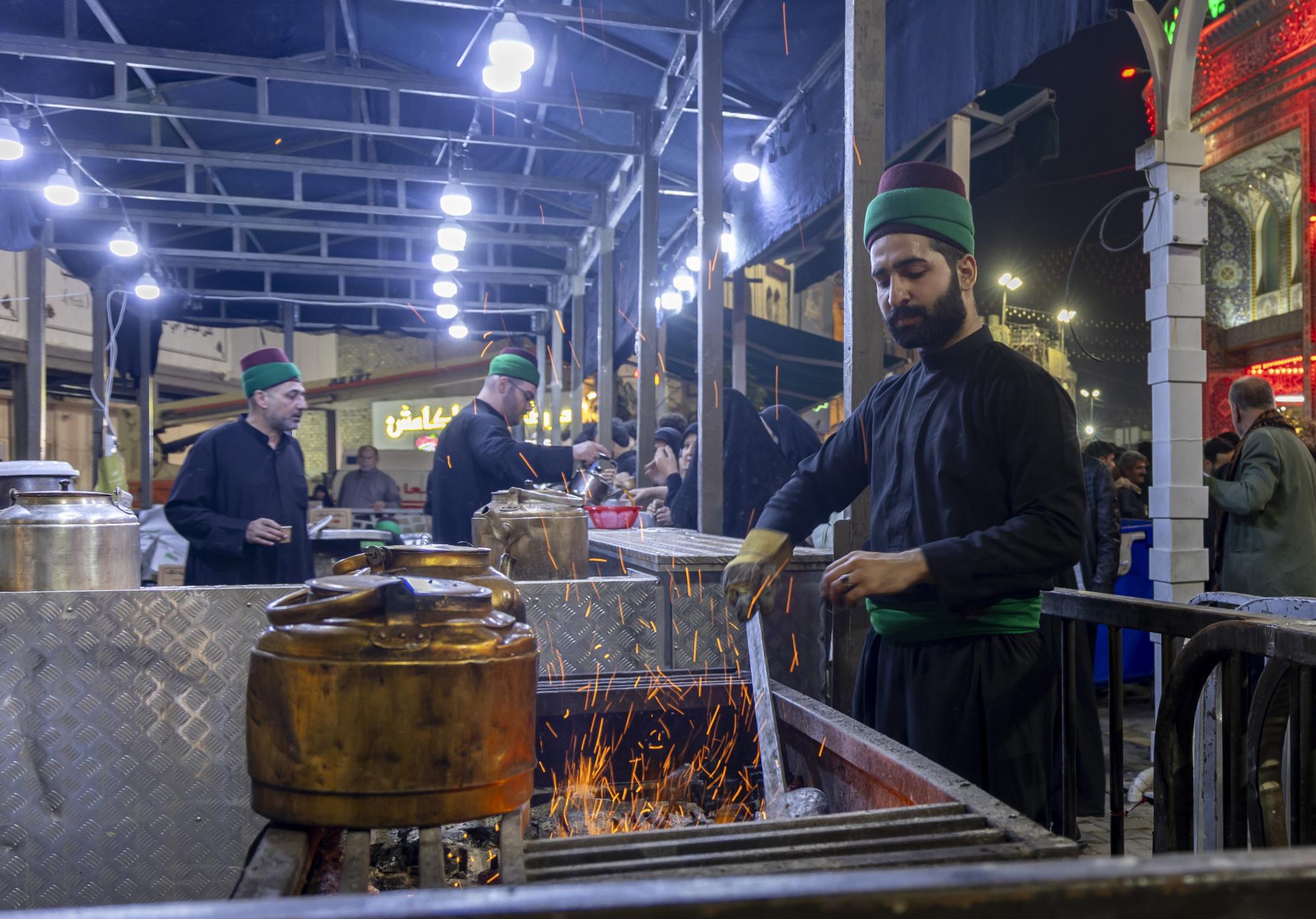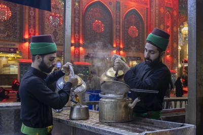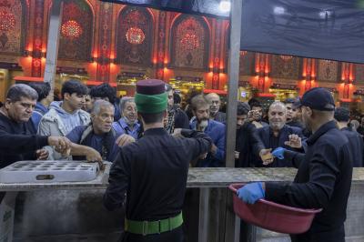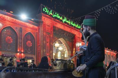 Mukaddes Hz. Abbas (a.s.) Türbesi'ndeki Seyyid Hizmetkarlar Şubesi personeli, hizmet alayı aracılığıyla ikinci rivayete göre Hz. Fatıma Zehra'nın (s.a.) şehadet yıldönümünde ziyaretçilere hizmetlerini sunuyor.