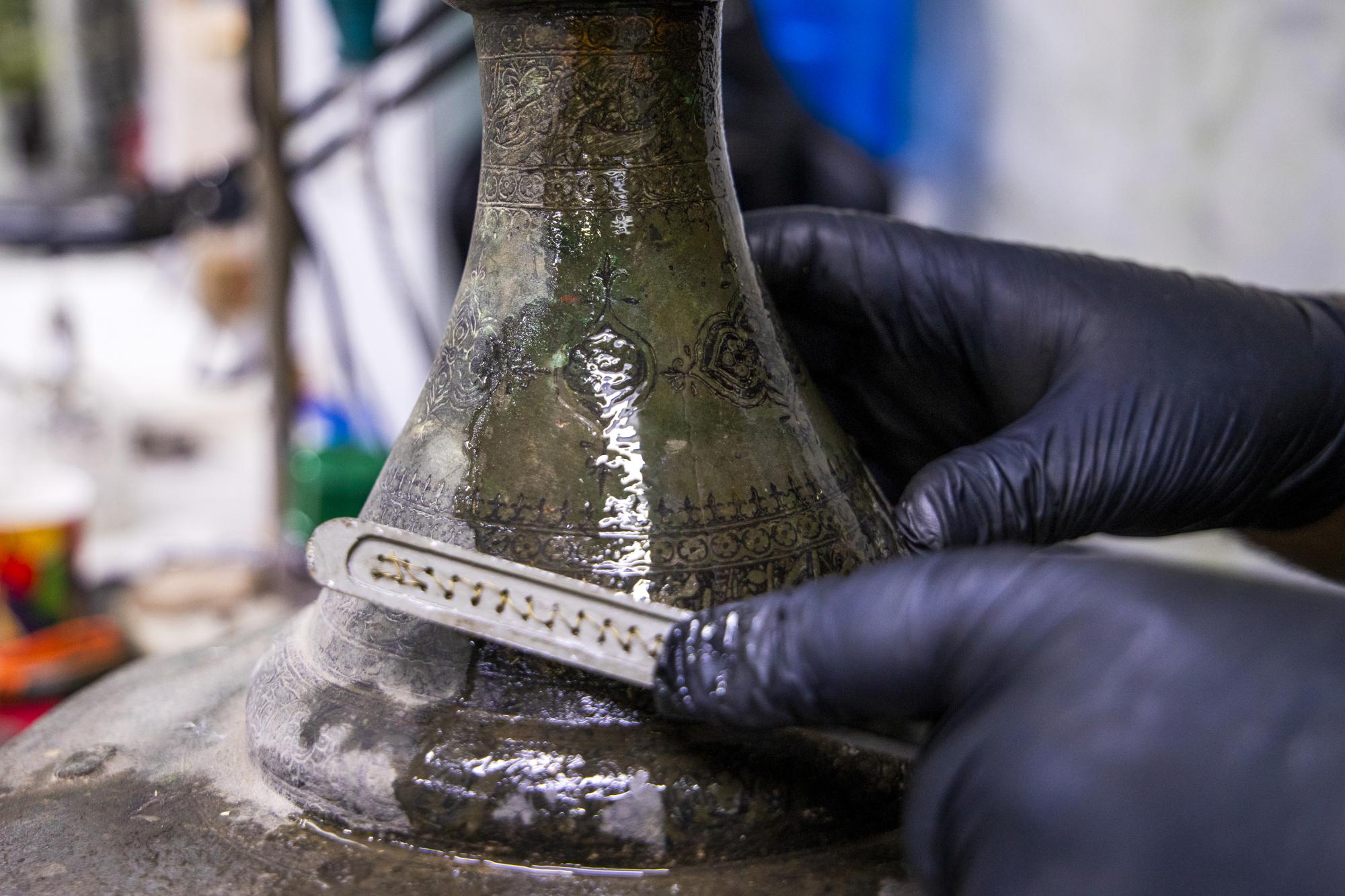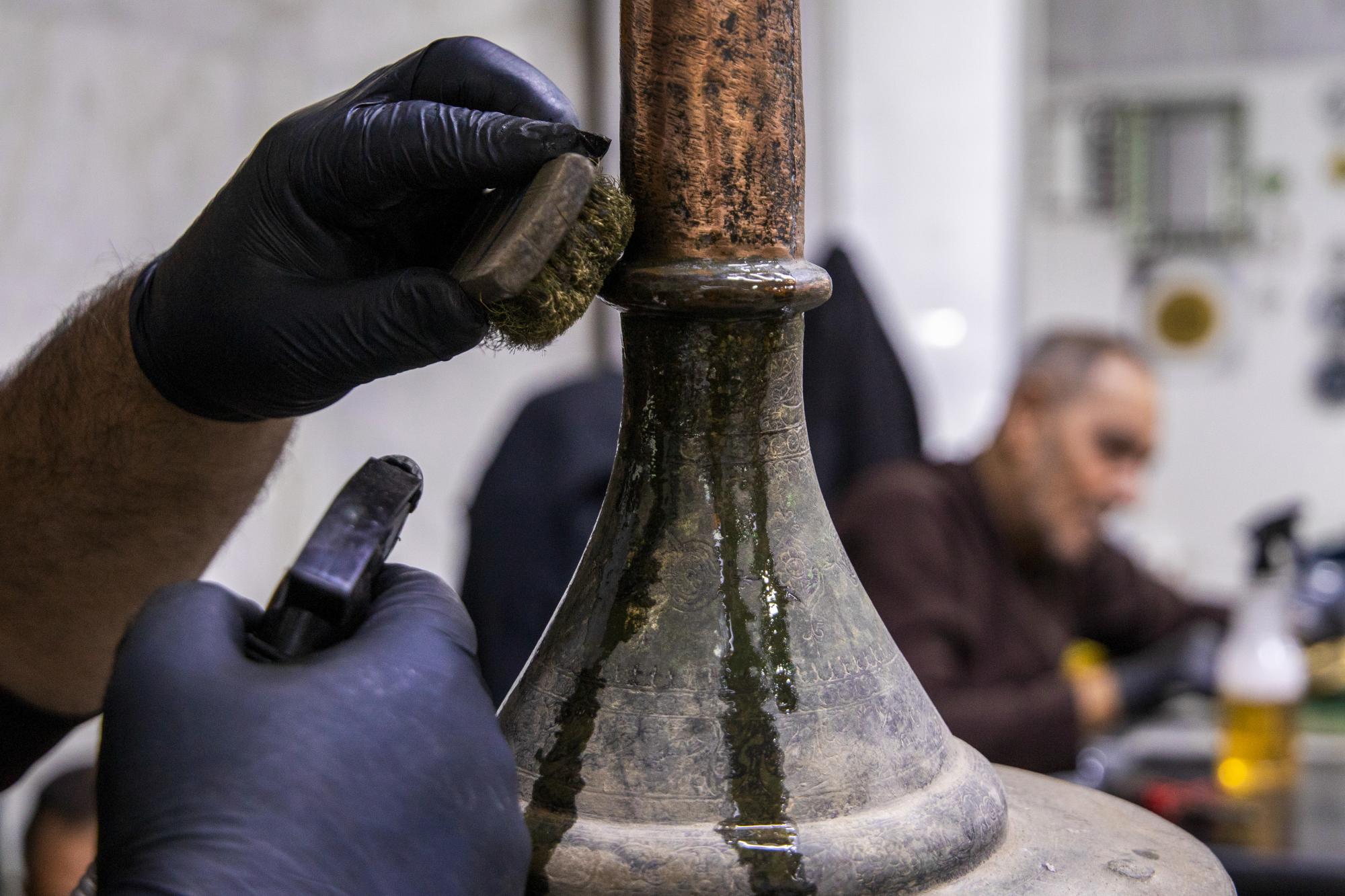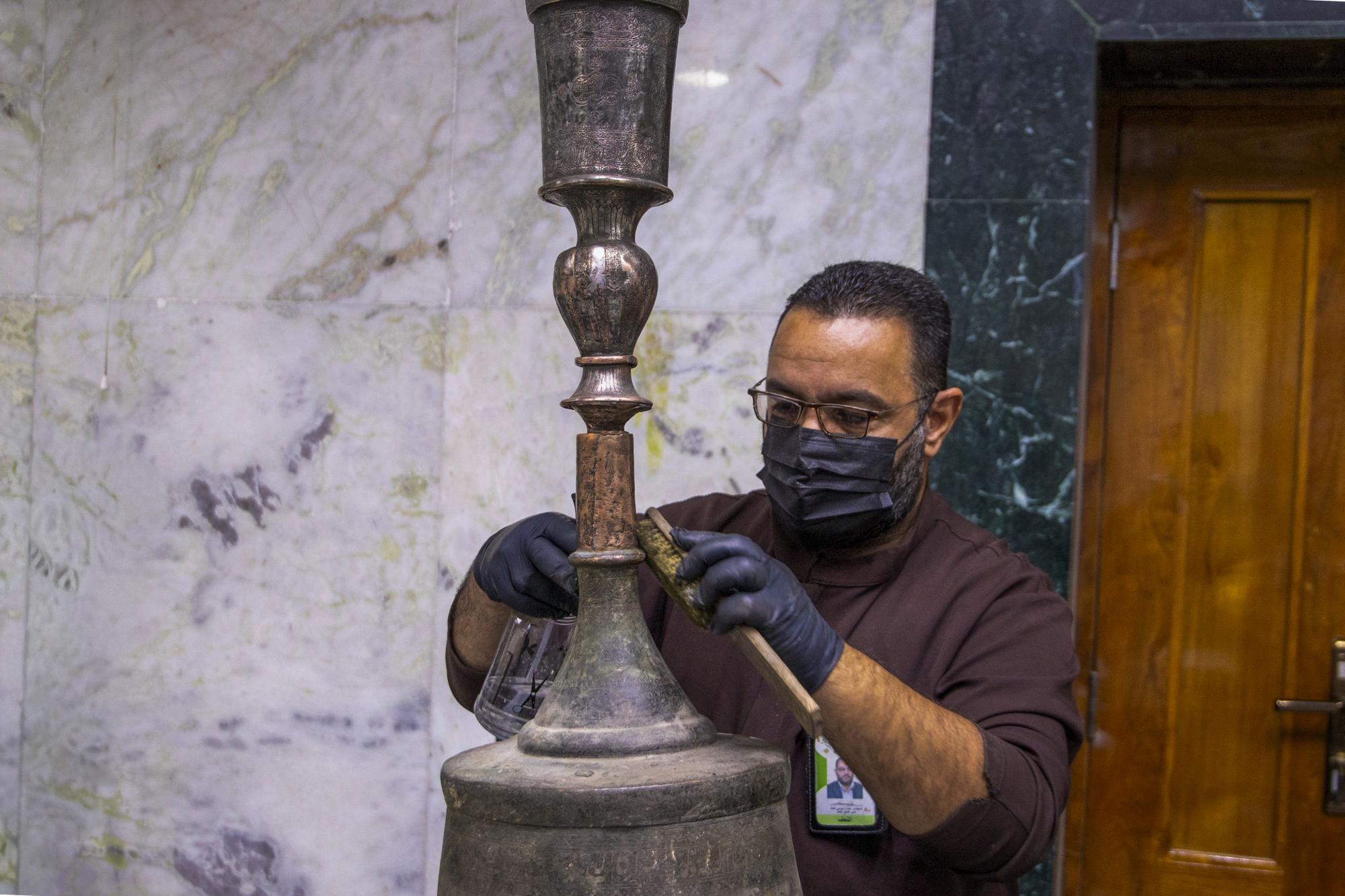 Il a ajouté : « Le personnel du laboratoire a entrepris un travail d'entretien méticuleux sur le chandelier en cuivre, richement décoré de motifs floraux, y compris la restauration de sa base, qui avait été endommagée par le temps, en vue de son exposition dans le hall principal du musée. »