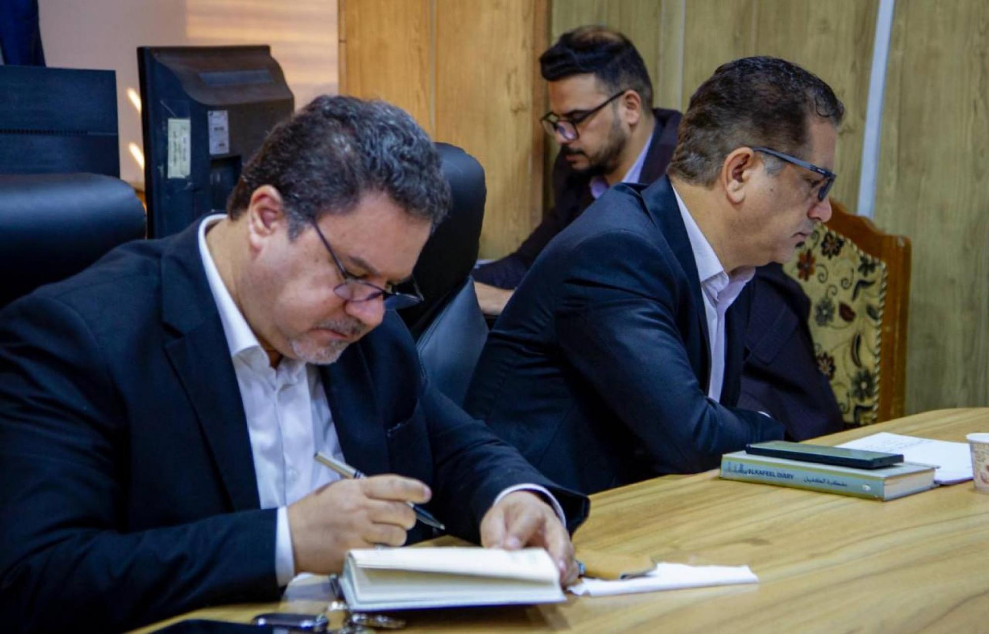 وتناول المجتمعون المستلزمات الخاصة بعقد لقاء لاستضافة كلية الإمام الكاظم (عليه السلام) - أقسام ذي قار، وكلية التربية للعلوم الإنسانية، للتباحث عن آفاق التعاون في الأنشطة العلمية والمجالات البحثية المشتركة.