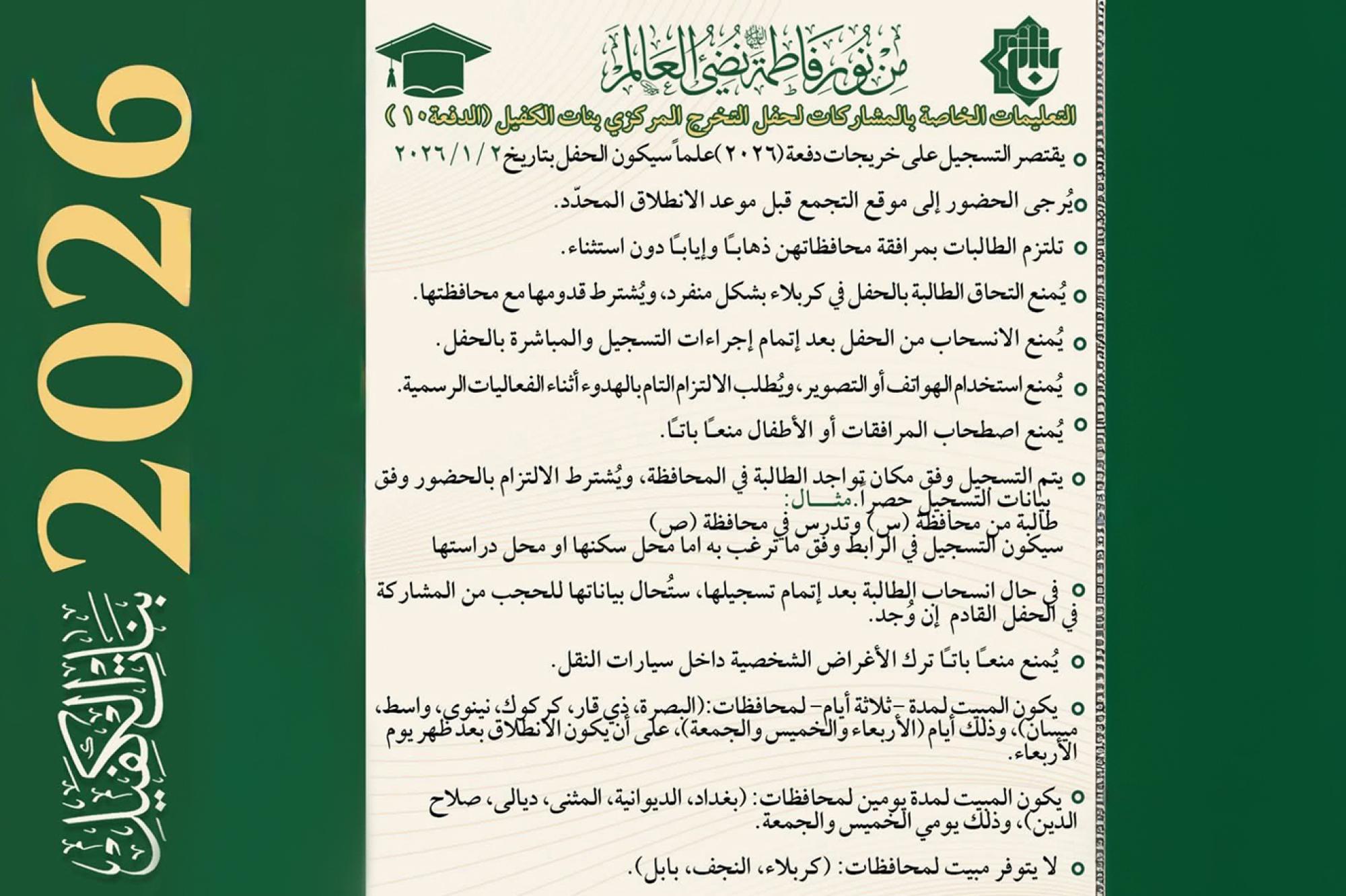 أعلنت العتبة العباسية المقدسة التعليمات الخاصة بالتسجيل في الحفل المركزي لتخرج طالبات الجامعات العراقية والدول الإسلامية (دفعة بنات الكفيل العاشرة).