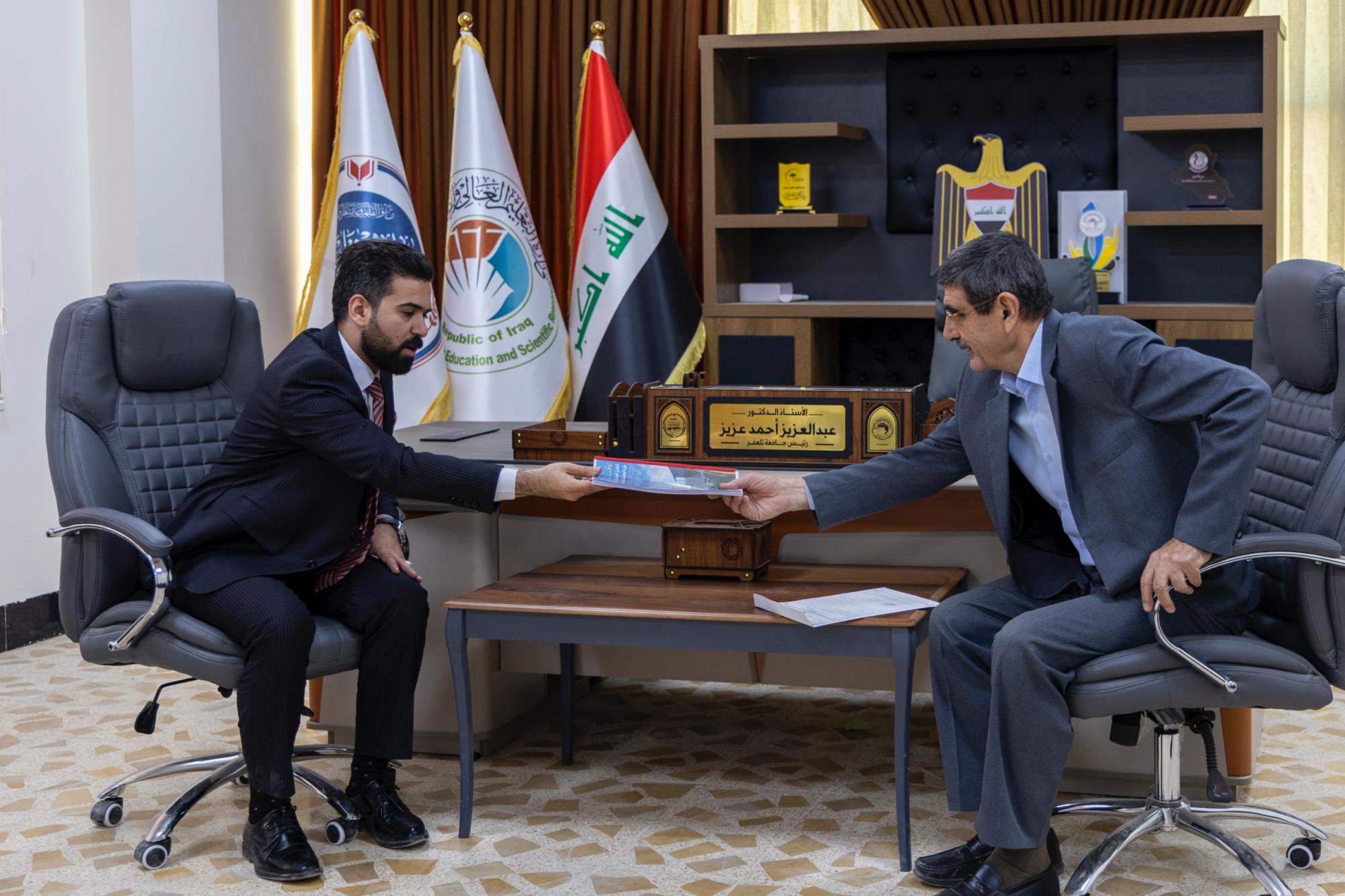 ومن جانبه ذكر رئيس الجامعة، الدكتور عبد العزيز أحمد، أنّ "الجامعة استقبلت وفدًا من العتبة المقدسة؛ الذي قدم دعوة للمشاركة في حفل التخرج المركزي لطلبة الجامعات"، مبينًا أنّ "العتبة العباسية المقدسة تقدم خدمات كبيرة في مجال التعليم وبمختلف المجالات، إلى جانب المبادرات التي تطلقها؛ بهدف تعزيز وحدة الكلمة وتوحيد الصف الوطني العراقي".