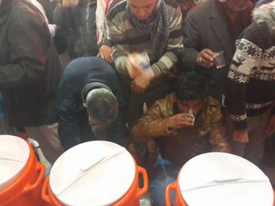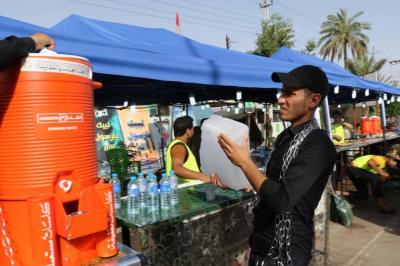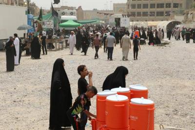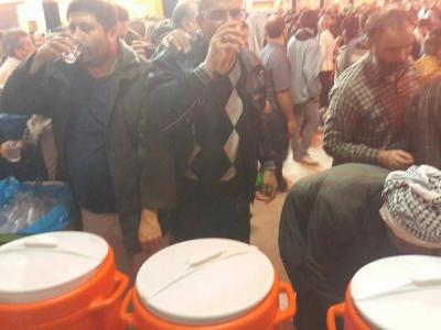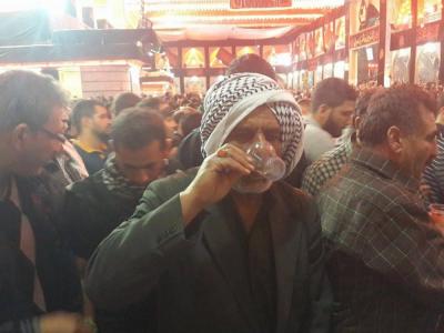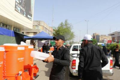 La distribution d'eau potable pour les visiteurs et les mawakibs est l'une des principaux services durant la ziyarat de l'Arbaeen en particulier pendant les jours plus chauds que d'habitude. La division de distribution d'eau affiliée à la section des services au saint sanctuaire a, au total 300 000 litres ont été servis, 4 millions de goblets jetables, c'est ce que le responsable de la division, M. Al-Hajj Ahmad Hanoun a déclaré pour le site officiel d'al-Kafil : « nous nous sommes organisé à distribuer l'eau sur deux axes : à l'intérieur de la cour et remplir les réserves dispersées dans la cour, à l'intérieur du saint tombeau et au sous-sol ( le sirdab). Le deuxième axe, à l'extérieur de la cour et la zone d'Entre al-Haramayne et les rues proches où les citernes d'eau tournaient. Tout le personnel de la division s'est mobilisé à maintenir les distributions chaque jour malgré le très grand nombre de visiteurs,»