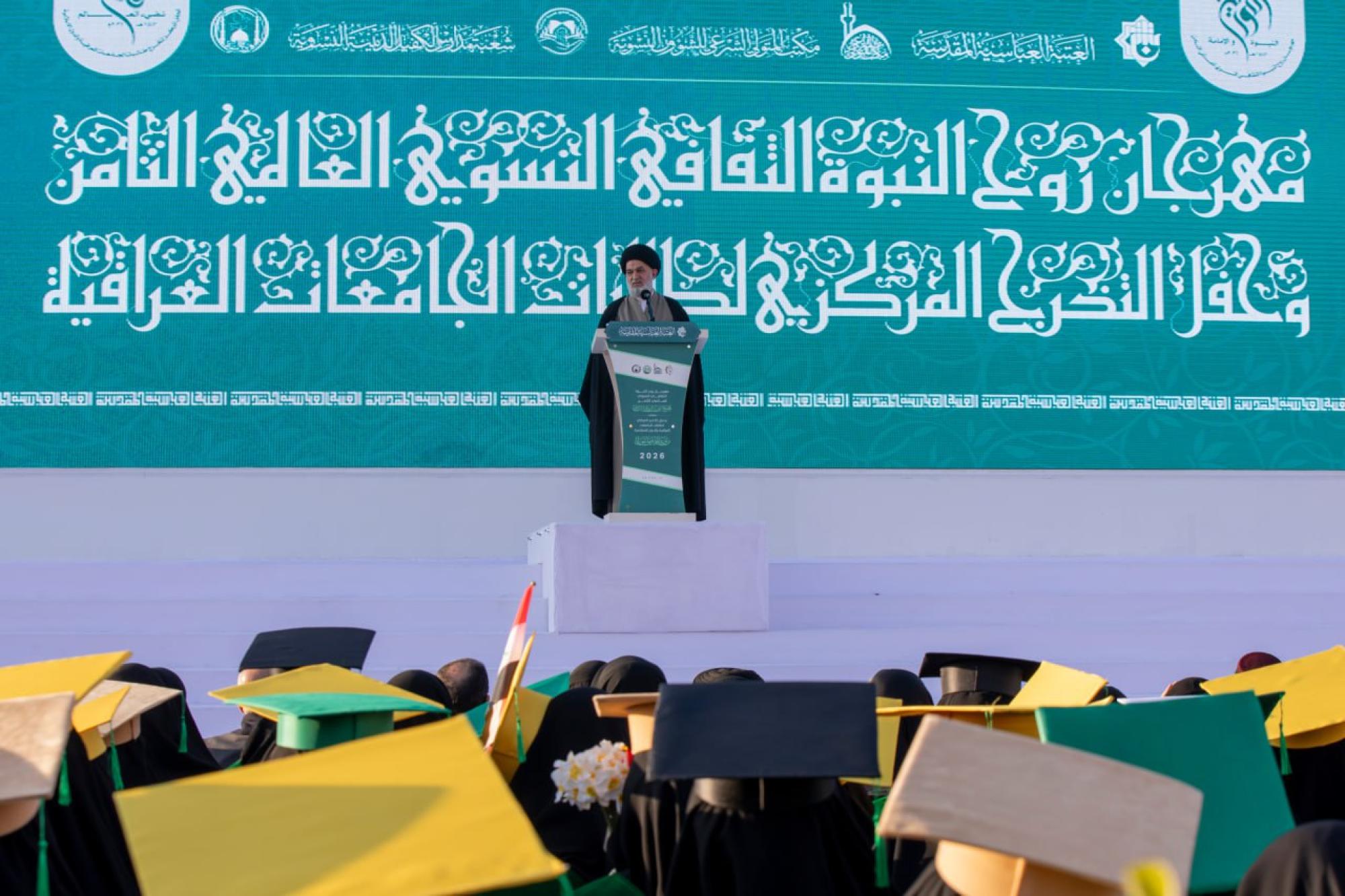 جاء ذلك في كلمته التي ألقاها، ضمن فعّاليات الحفل الختامي لتخرّج طالبات الجامعات العراقيّة العاشر، الذي تقيمه شعبةُ مدارس الكفيل الدينيّة النسويّة، التابعة لمكتب المتولّي الشرعيّ للشؤون النسويّة في العتبة العبّاسية المقدّسة، تحت شعار (من نُورِ فاطمةَ -عليها السلامُ- نُضيءُ العالَم)، بمشاركة أكثر من 5000 طالبةٍ من 14 محافظةً عراقية، مع مجموعةٍ من الطالبات مثّلنَ 12 دولةً من غير البلد المضيِّف العراق.