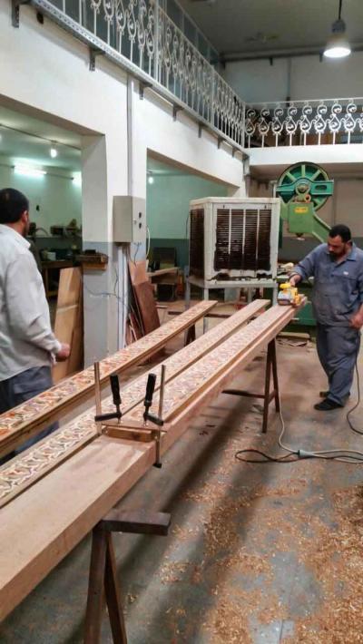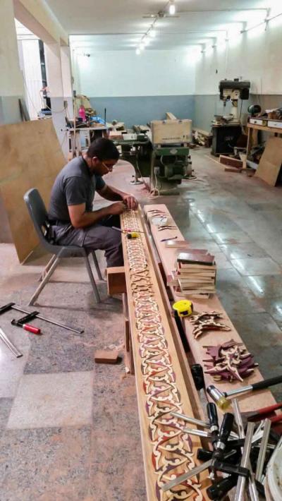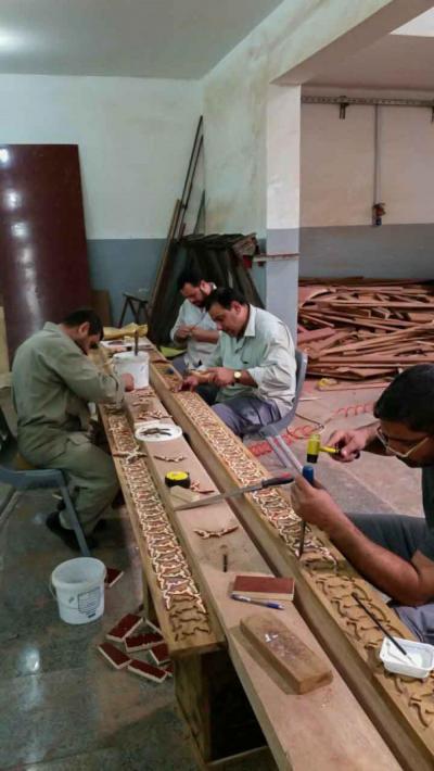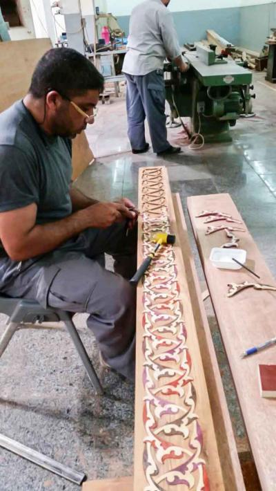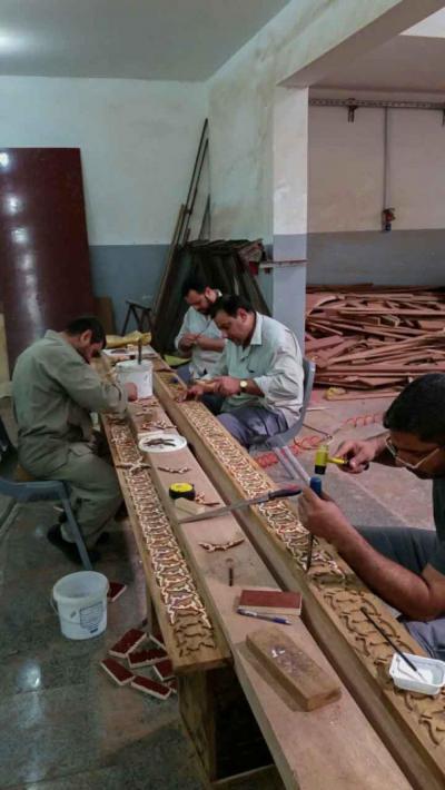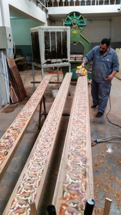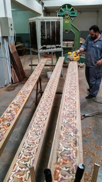 The manufacture of the grafting belt was made out of Burmese teak with the white oak for the inscriptions, and these two decorative frameworks along with the Quranic inscription form a harmonious piece of art in terms of the color of the wood and its inscritions and it became like a one-piece, and the two top and bottom belts will be forming with the Quranic inscription on the wooden structure of the new grid in an unapparent skilled way.