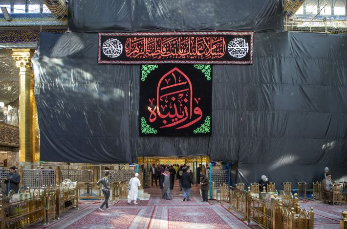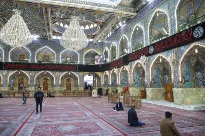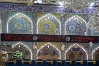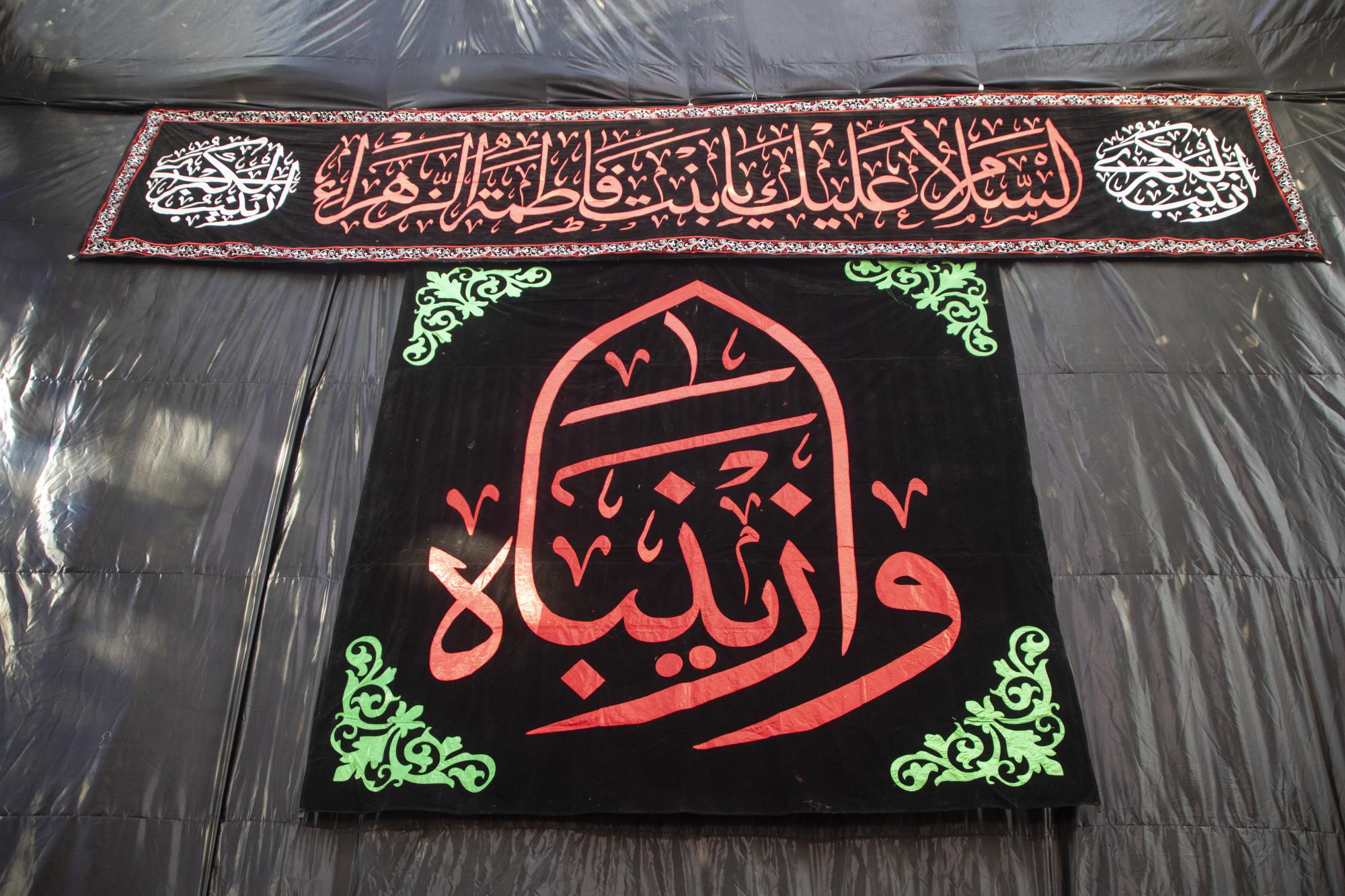 Le personnel du service d'entretien de la cour du Sanctuaire saint Al Abbas a déployé des bannières de deuil et de condoléances pour commémorer l'anniversaire du décès de Dame Zaynab (que la paix soit sur elle).