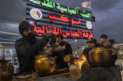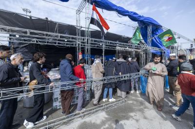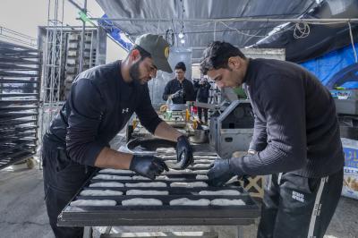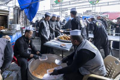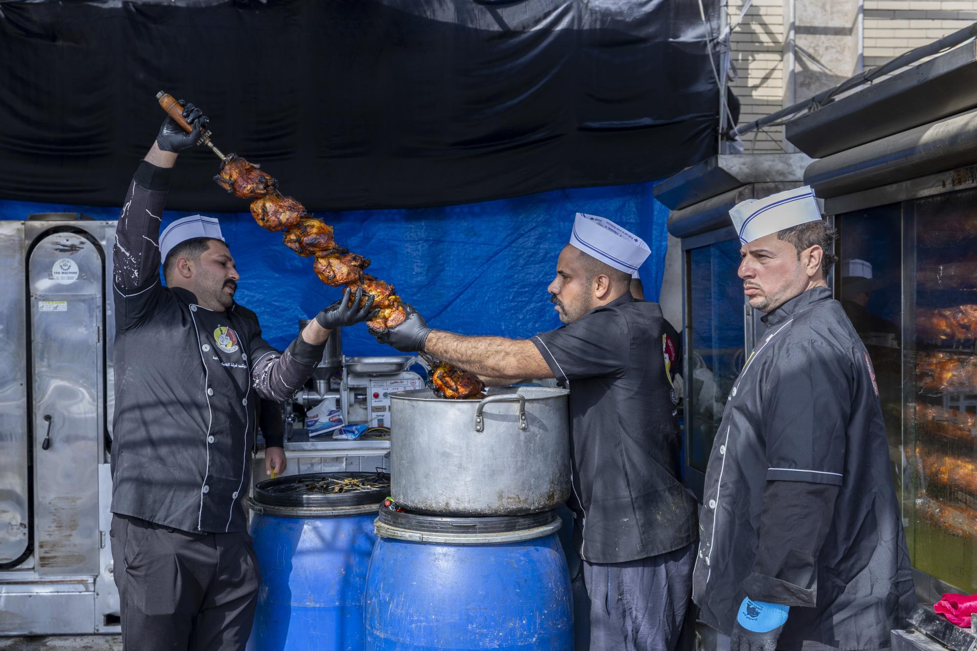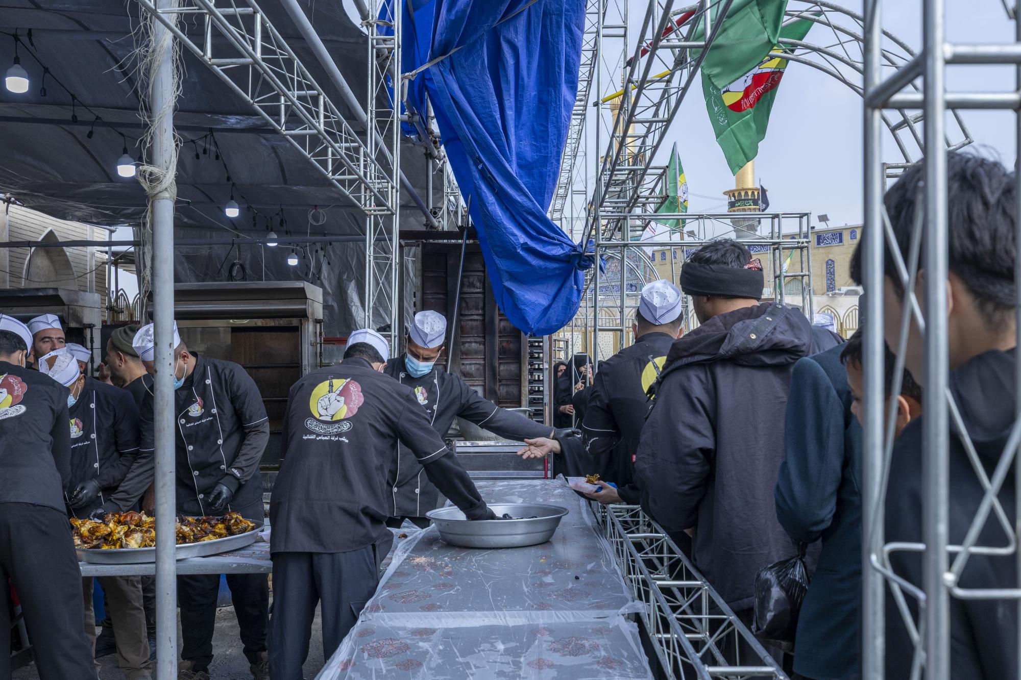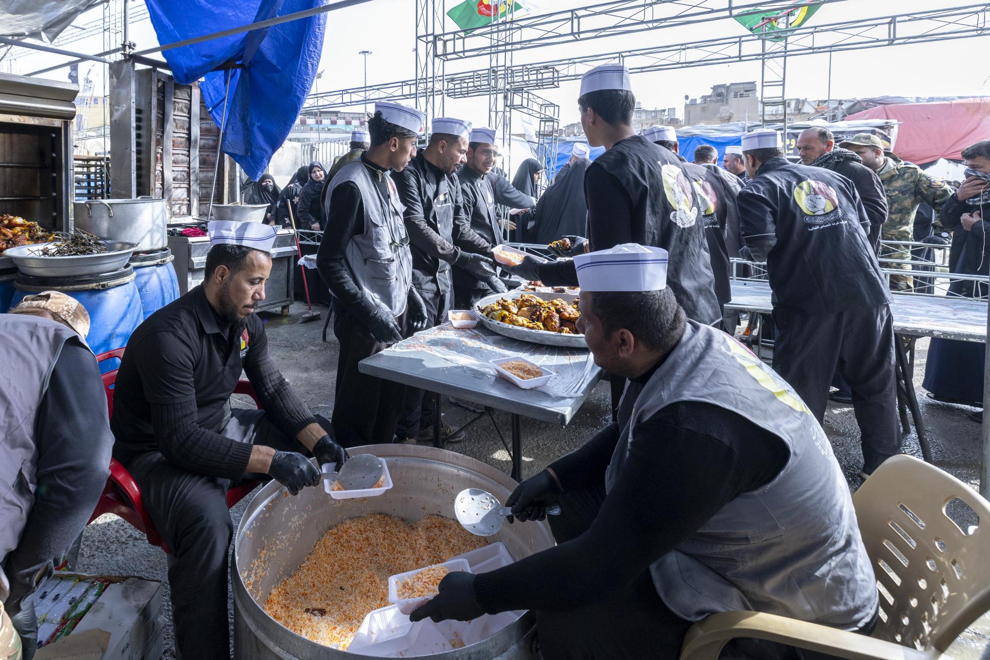 وأضاف أنّ "الموكب يقدم يوميًّا 15 ألف وجبة طعام رئيسة، إضافةً إلى الوجبات البينية، للزائرين المعزين بهذه المناسبة الأليمة" لافتًا إلى أنّ "الفرقة جهّزت فرنًا خاصًّا لإنتاج الصمون، إذ ينتج يوميًّا نحو 20 ألف قطعة".