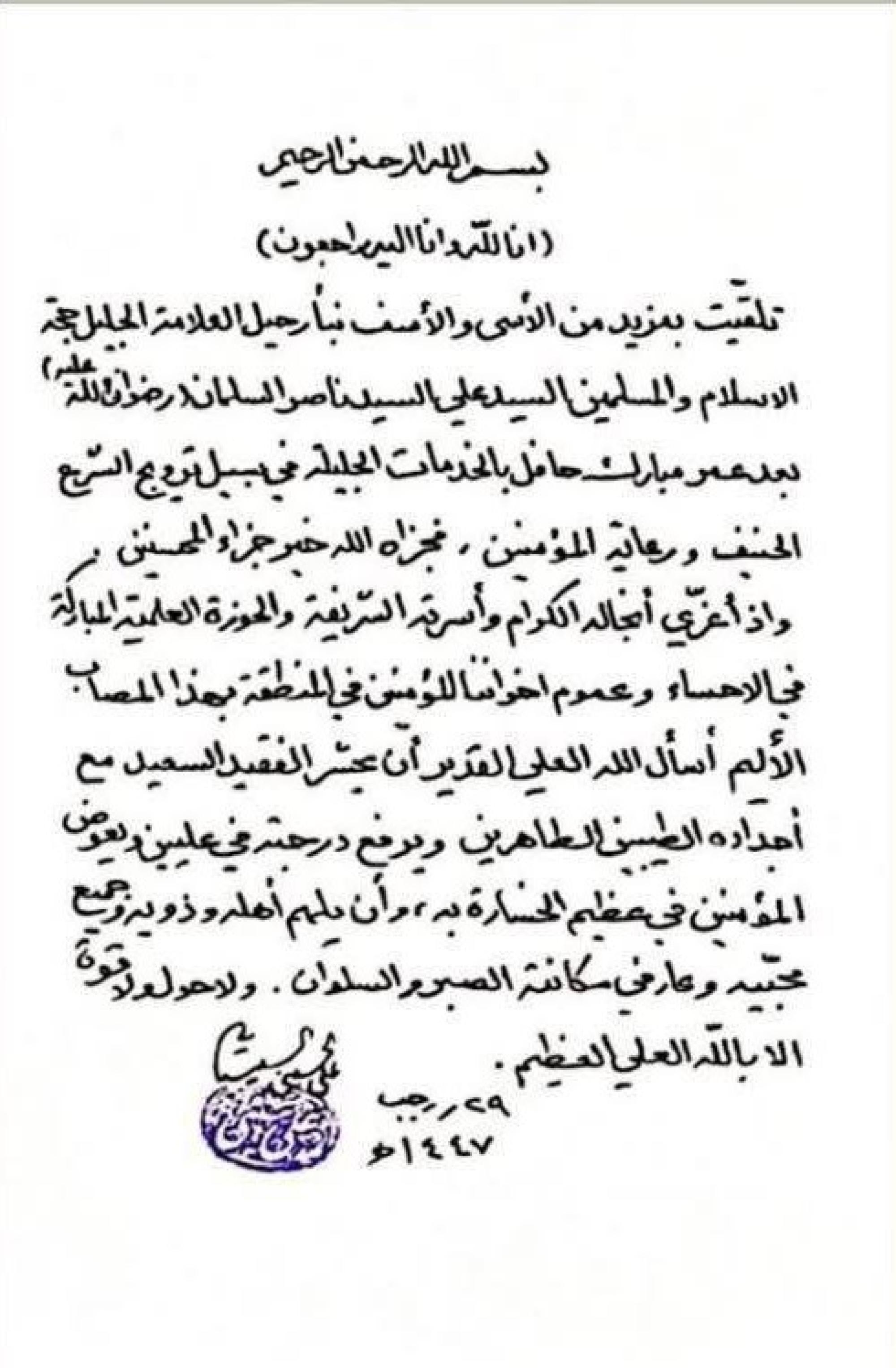 وإذ أعزي أنجاله الكرام وأسرته الشريفة والحوزة العلمية المباركة في الإحساء وعموم إخواننا المؤمنين في المنطقة بهذا المصاب الأليم أسأل الله العلي القدير أن يحشر الفقيد السعيد مع أجداده الطيبين الطاهرين وأن يرفع درجته في عليين ويعوض المؤمنين في عظيم الخسارة به، وأن يلهم أهله وذويه وجميع محبيه وعارفي مكانته الصبر والسلوان.