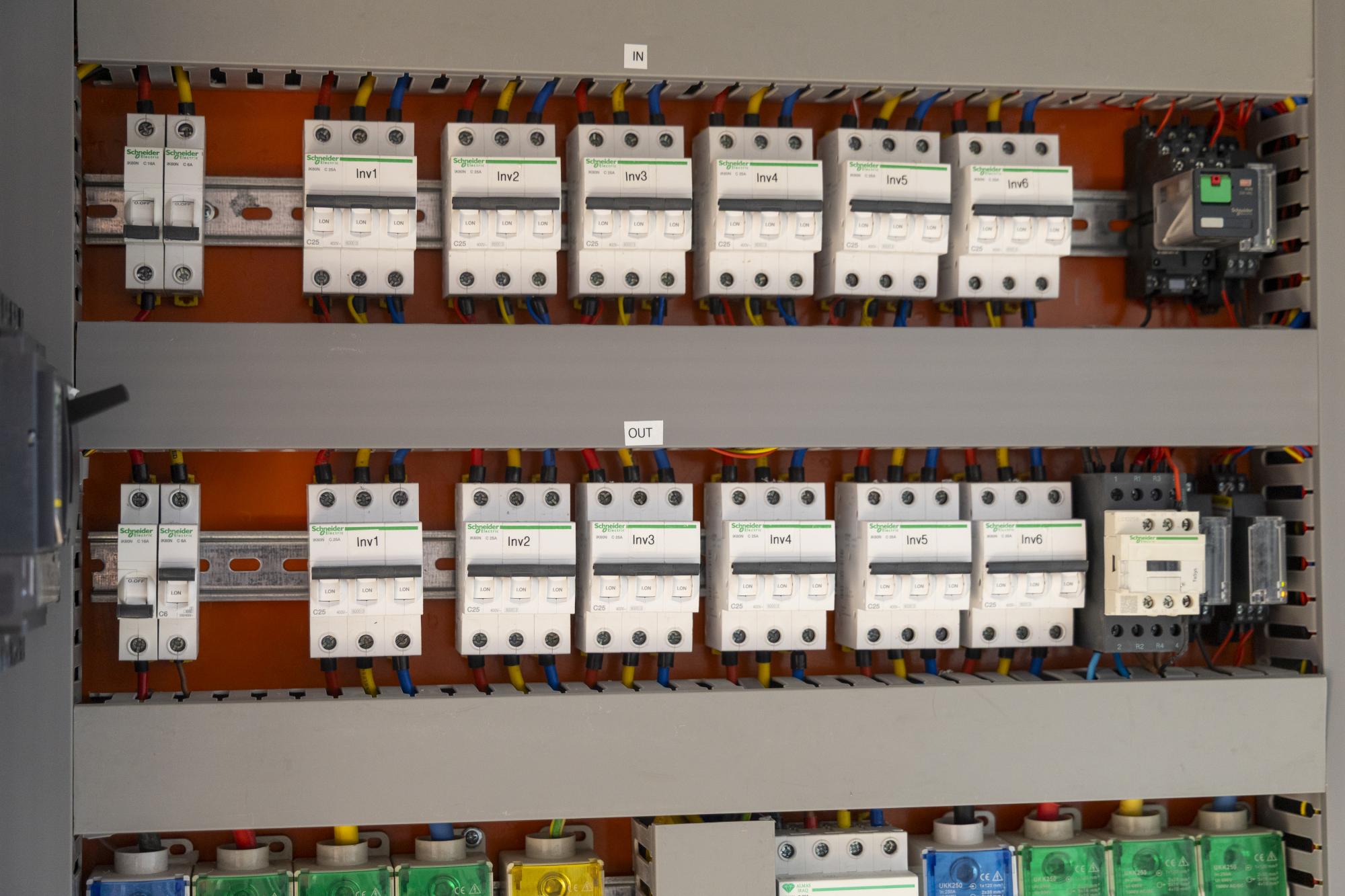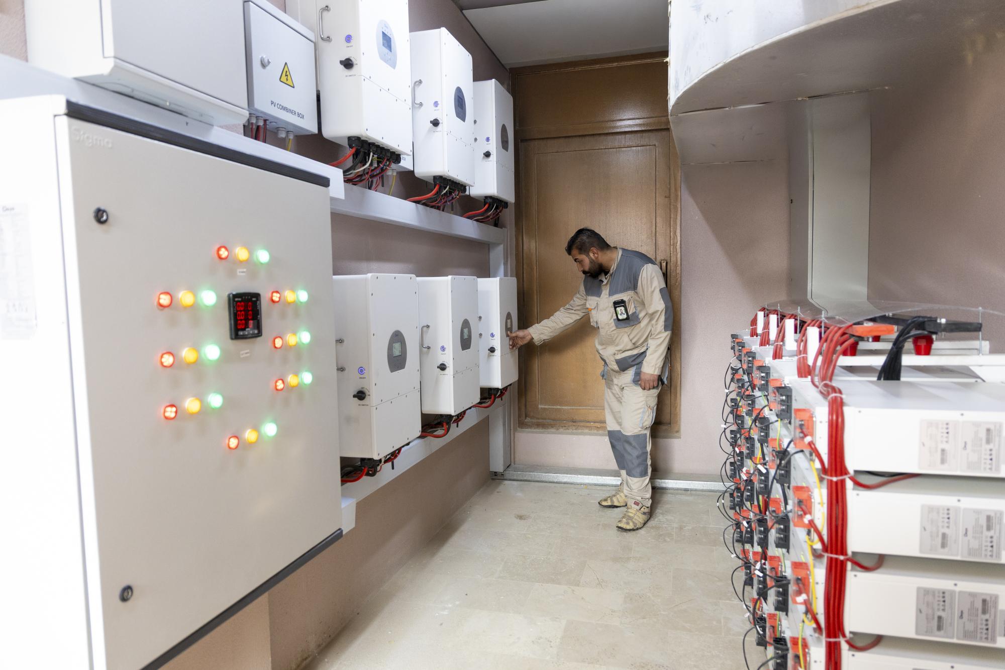 وأضاف أن المنظومة تضم ست عاكسات ثلاثية الأقطاب (3 Fuses) بقدرة 12 كيلو واط لكل عاكسة، إضافة إلى 30 بطارية ليثيوم ذكية (Smart Lithium Batteries) بقدرة 48 فولت، ومجهزة بخلايا شمسية حديثة بقدرة 610 واط لكل خلية.