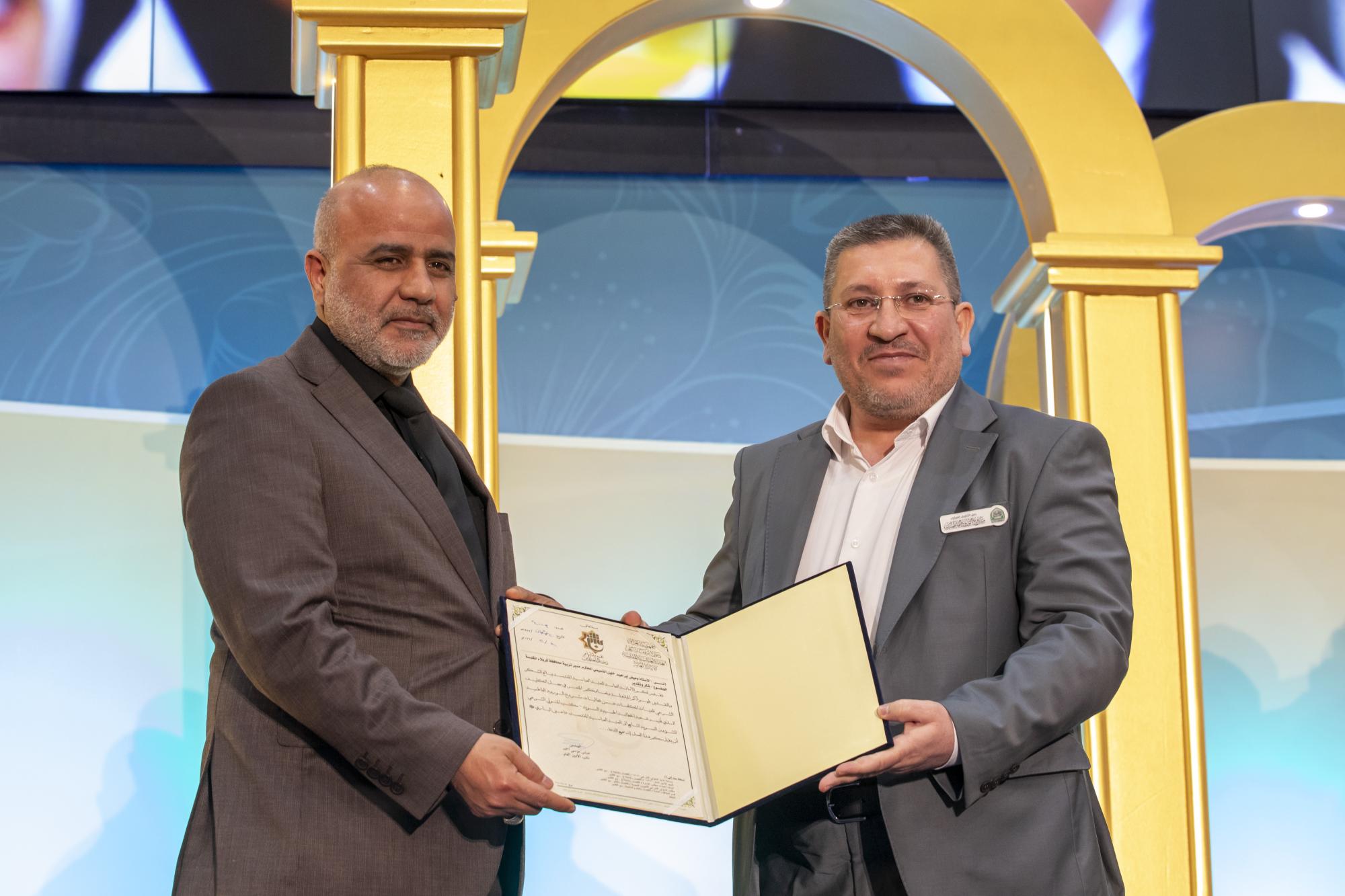 At the conclusion of the ceremony, the Deputy Secretary-General of the Holy Shrine, Mr. Abbas Moussa Ahmed, and the members of its Board of Directors, Mr. Mohammed Al-Ashigar and Dr. Afdal Al-Shami, honored the Karbala Education Directorate and several educational supervisors in appreciation of their efforts.