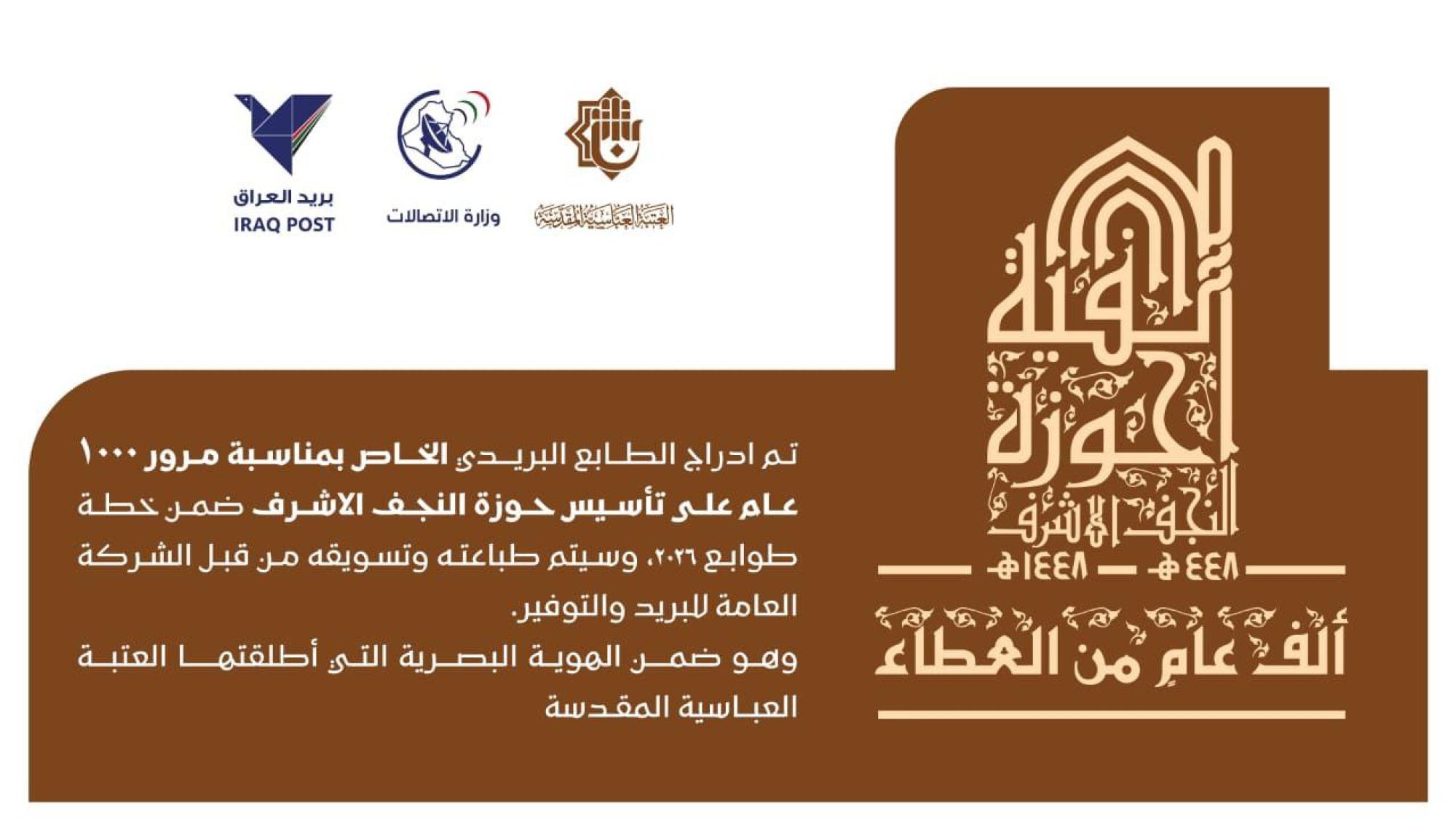 The Iraqi Ministry of Communications included the commemorative postage stamp marking the 1000th anniversary of the establishment of the Najaf Ashraf Hawza in the 2026 stamp plan.