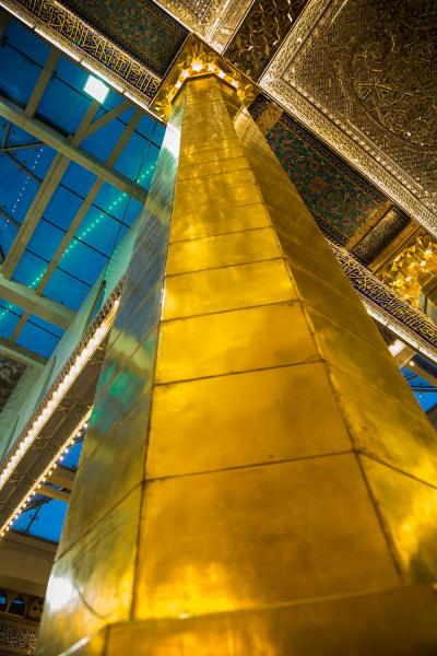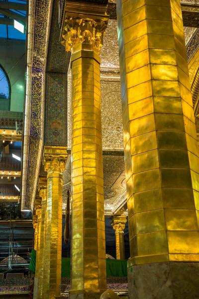 المرحلة الخامسة: تغليف هذه الأعمدة بالبلاطات الذهبية التي تمّ تصنيعها في ورش العتبة المقدّسة باستخدام تقنيّة الطَّرْق على جلد الغزال الذي أثبت كفاءته بكافّة أعمال تذهيب العتبة المقدّسة، وتمّ تركيبها على شكل خطوط مستقيمة (صفوف) تُحيط ببدن العمود وبطريقة تثبيتٍ مخفيّة غير ظاهرية، ممّا أضاف اليها جماليةً وعمراً أطول، وقد بلغ عددُ البلاطات الذهبية التي تمّ تركيبها للأعمدة ذات ارتفاع (9متر) (216) بلاطة، والأعمدة ذات ارتفاع (6متر) (136) بلاطة ذهبية.